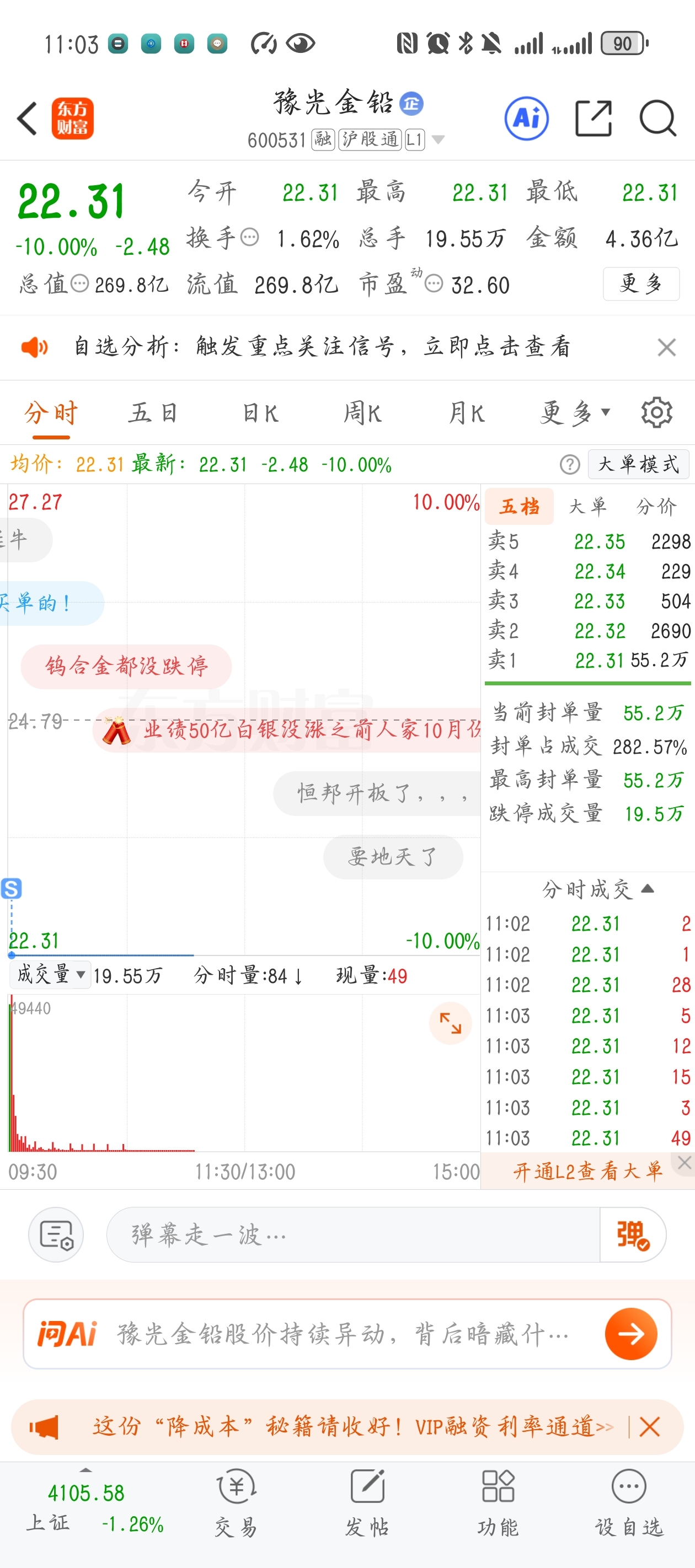 $豫光金铅(SH600531)$ 经过了神剑的跌停我看到地板直接跑,虽然我昨天打板进的