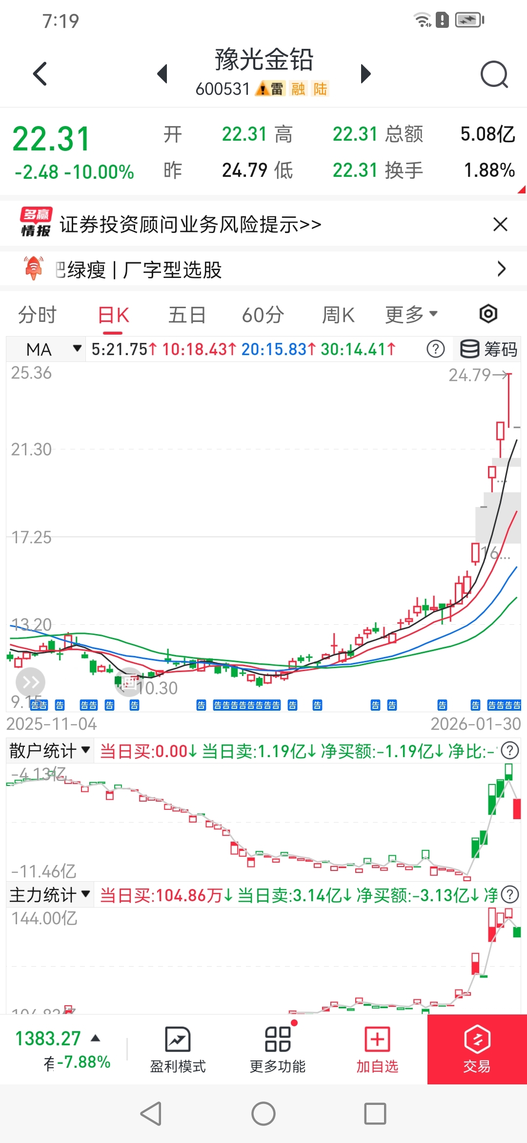$豫光金铅(SH600531)$ 经传多赢手机版数据,低开的原因是昨天开板后,控盘量化机构出货多余买货量,控盘量化机构是国外欧美量化系统的购买方。对接的是散户,一般一个股票里面有10个左右被对接散户。他们看着控盘量化数据拉升的,没有机构名称和数据软件的大单,都是高接拉升的。。。这个软件不是经传多赢,因为它没有机构名称统计。