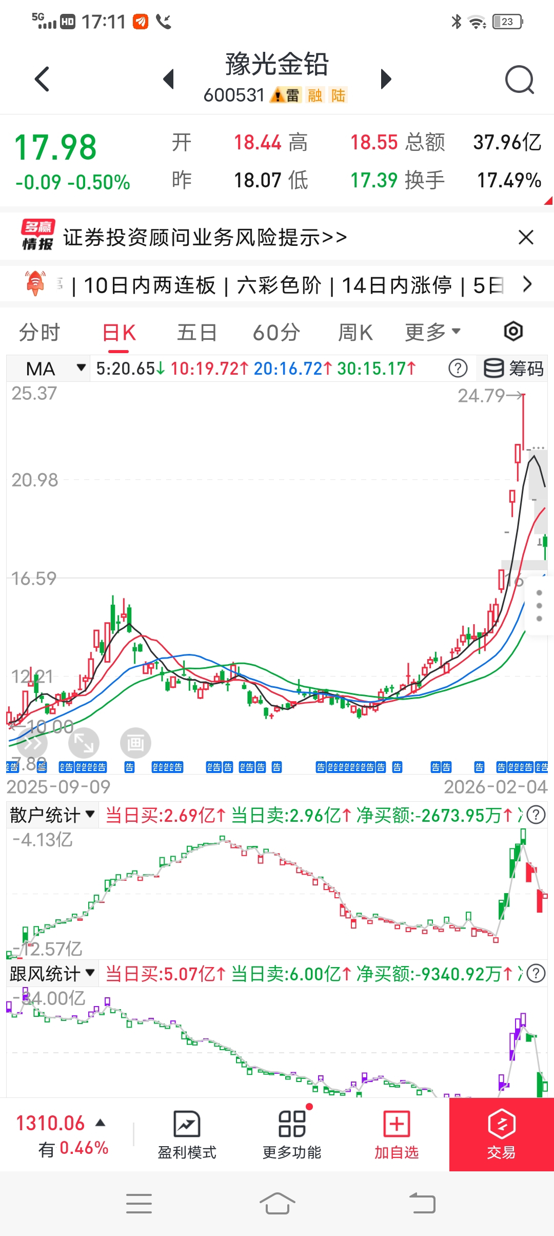 $豫光金铅(SH600531)$ 经传多赢手机版数据123元,我也是济源人,这是控盘量化出货了,出货量不能大于当天吃货量1/3,他们在跟卖,因为控盘量化控制开盘价的,对接的是一部分散户,大概是6个散户左右,都是欧美国家的量化公司产品卖给谁就是谁的量化。还有暗庄量化,软件看不见数据,程序是大买小,时间上是大碰小,才会集合竞价接货,持续拉升才能上涨。目前他们都是睁着眼睛买货的,或者在跟控盘机构买