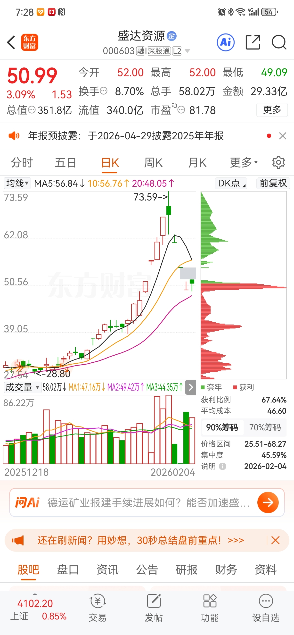 兴业银锡,第三个跌停打开回涨两天,盛达资源回涨两天。这就是区别,考虑换进资源股,