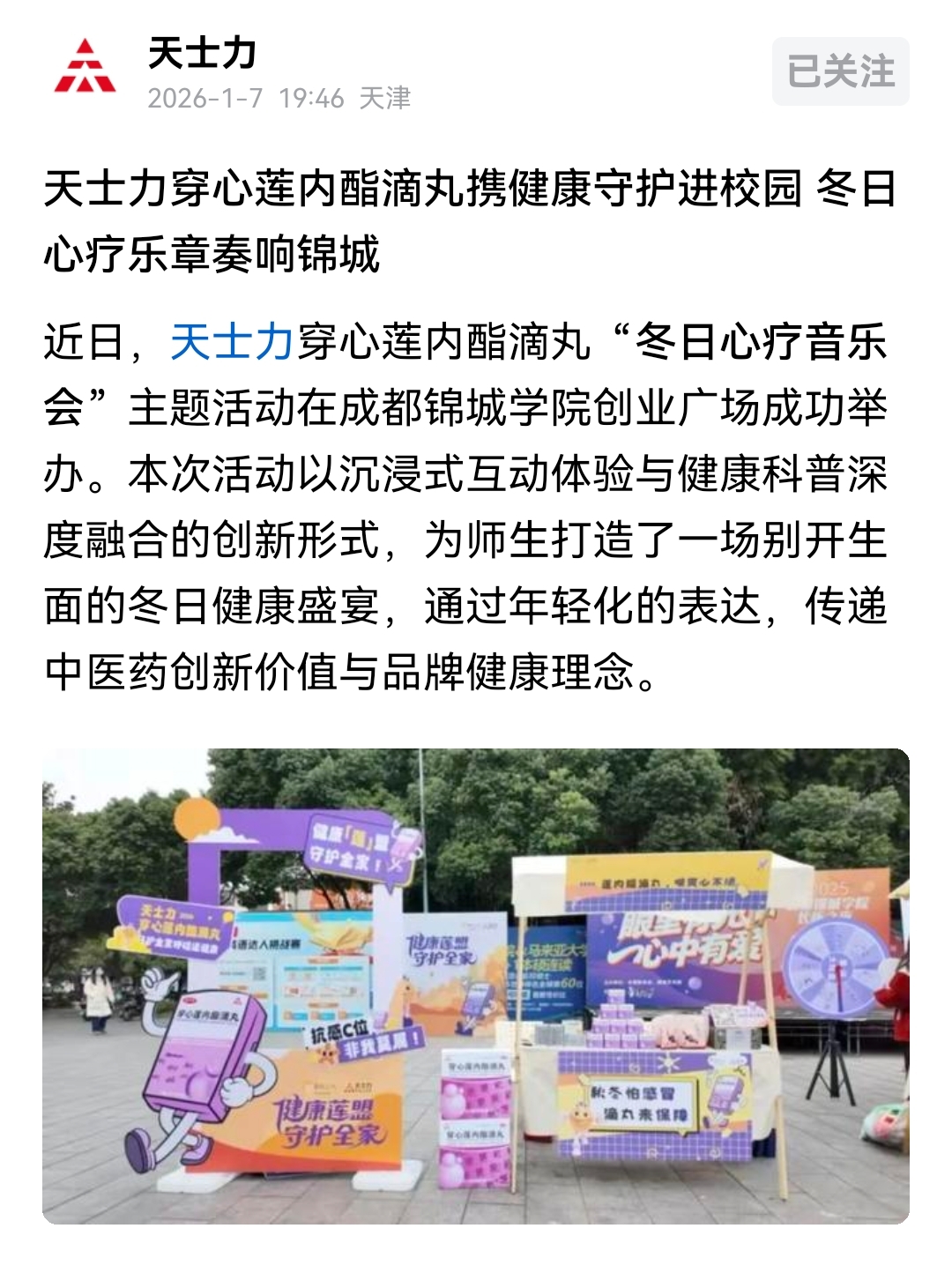 近段时间天士力持续在做〝穿心莲内酯滴丸”的推广与宣传。