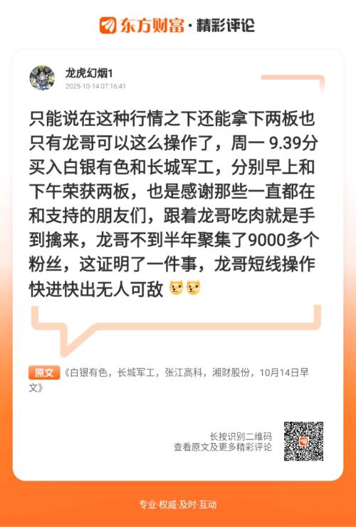 必须转发!跟着学不吃亏 //@龙虎幻烟1 :只能说在这种行情之下还能拿下两板也只有龙哥可以这么操作了,周一 9.39分买入白银有色和长城军工,分别早上和下午荣获两板,也是感谢那些一直都在和支持的朋友们,跟着龙哥吃肉就是手到擒来,龙哥不到半年聚集了9000多个粉丝,这证明了一件事,龙哥短线操作快进快出无人可敌 $中国软件(SH600536)$$多氟多(SZ002407)$$奥普光电(SZ002338)$