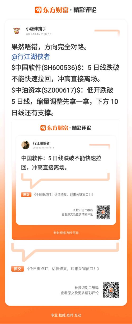 老师,您给的方向特别准,真心谢谢您的分享!@行江湖侠者 :果然唔错,方向完全对路。@行江湖侠者 $中国软件(SH600536)$:5 日线跌破不能快速拉回,冲高直接离场。 $中油资本(SZ000617)$:低开跌破 5 日线,缩量调整先拿一拿,下方 10 日线还有支撑。