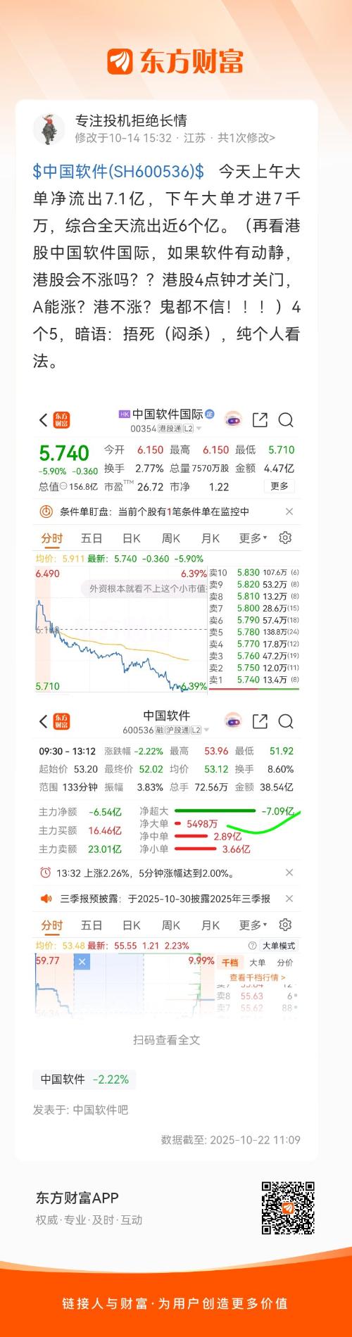$中国软件(SH600536)$   今天上午大单净流出7.1亿,下午大单才进7千万,综合全天流出近6个亿。(再看港股中国软件国际,如果软件有动静,港股会不涨吗??港股4点钟才关门,A能涨?港不涨?鬼都不信!!!)4个5,暗语:捂死(闷杀),纯个人看法。