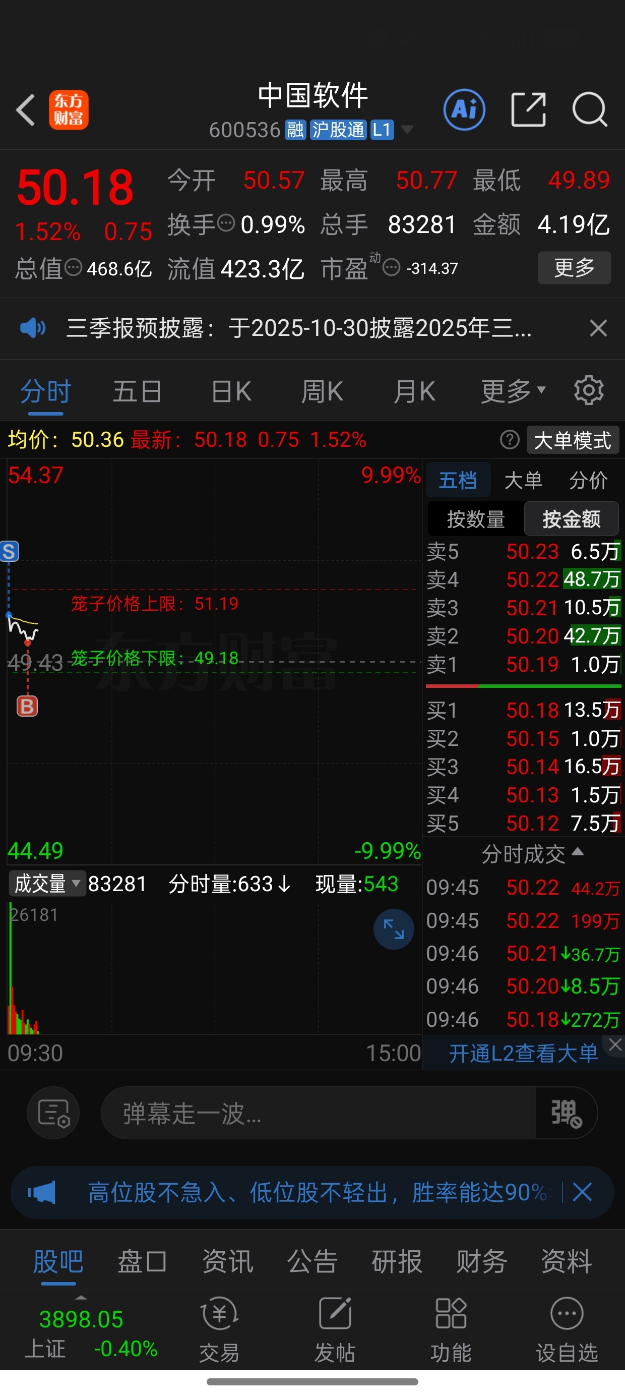 $中国软件(SH600536)$ 给点肉就走,不能格局,