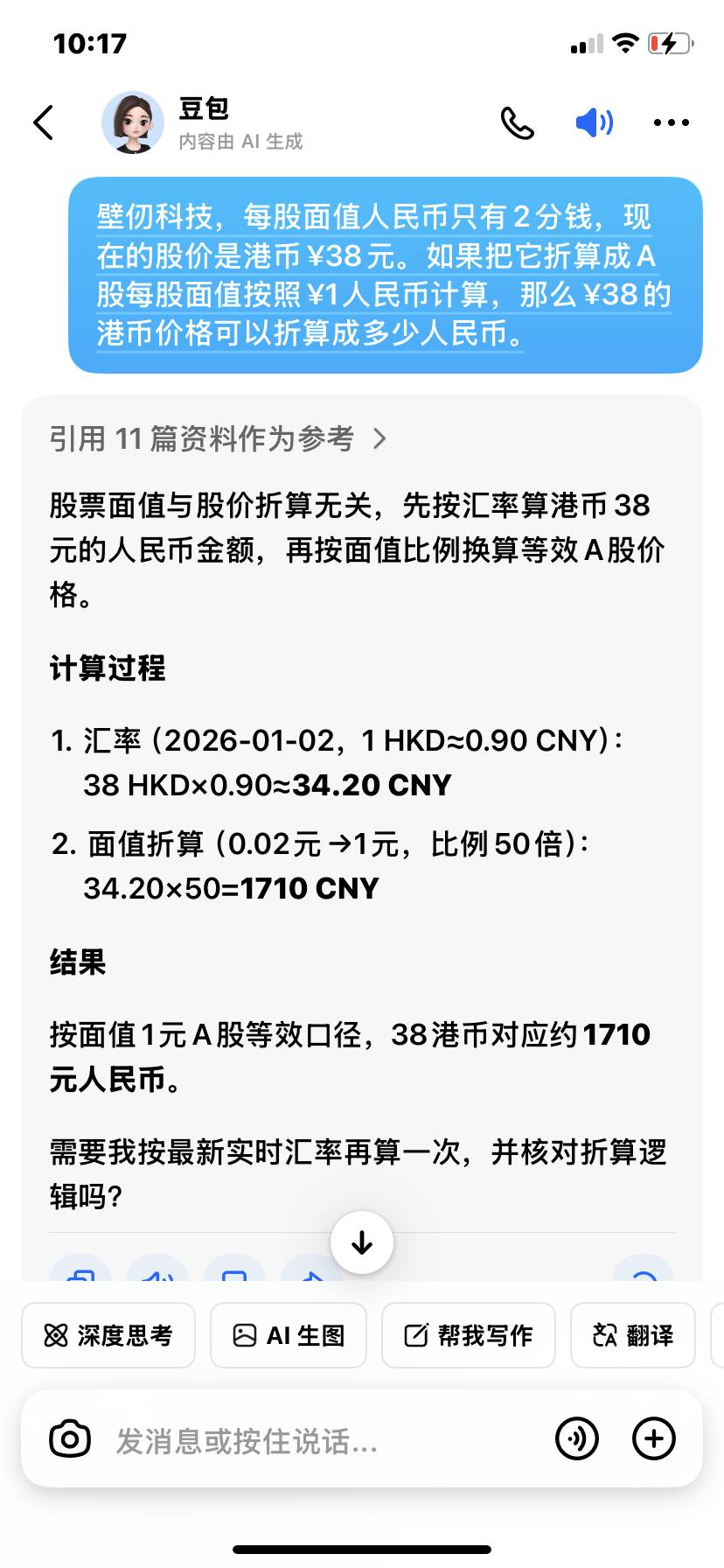 $中国软件(SH600536)$ 大A的股票,每股面值都是1元人民币,壁仞科技,每股面值人民币只有2分钱,现在的股价约是港币38元。实际上折合人民币每股的股价是1710元人民币。那么中国软件的股价应该是多少呢?
