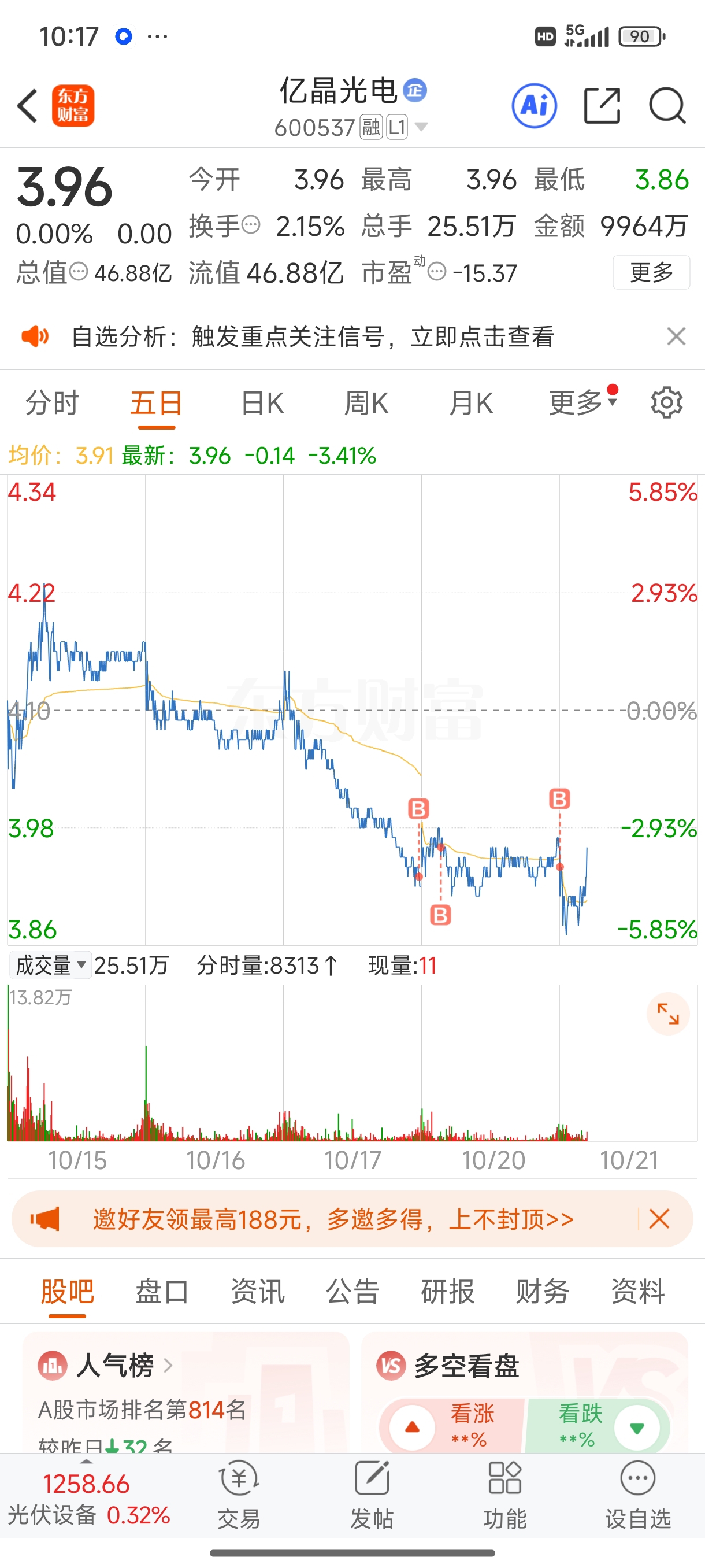 $亿晶光电(SH600537)$ 加仓,兄弟们!调整结束,变盘十字星,拐头向上啦!