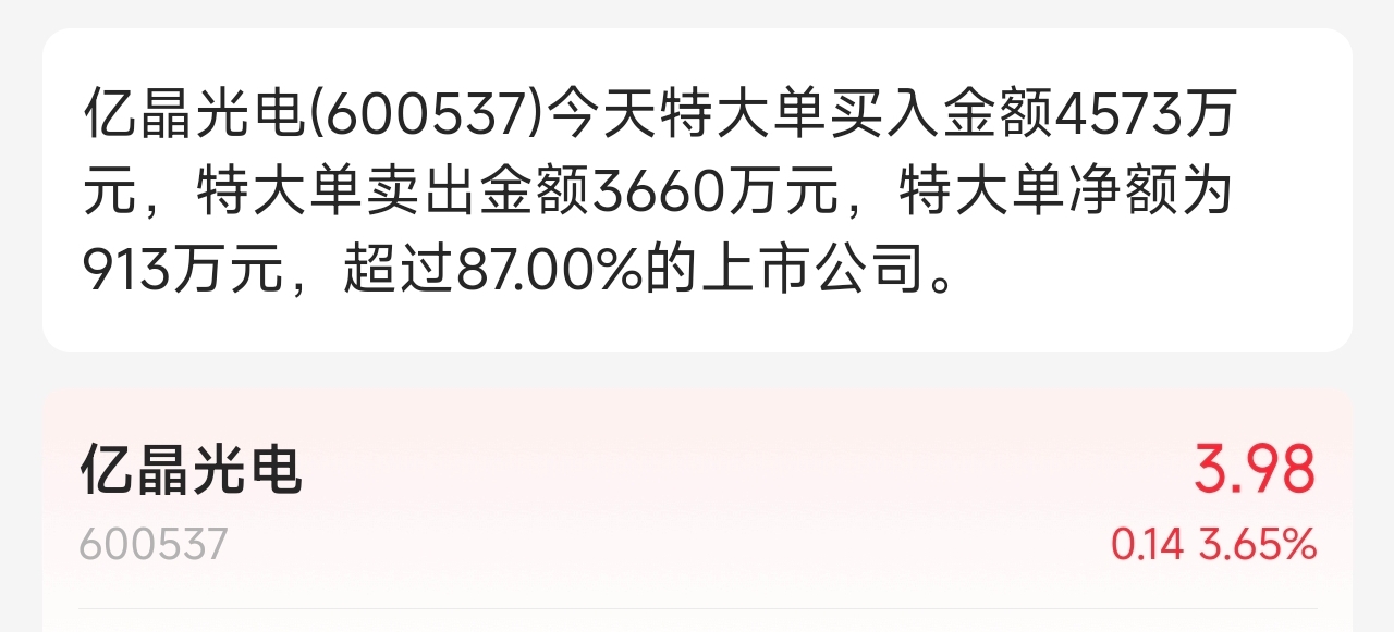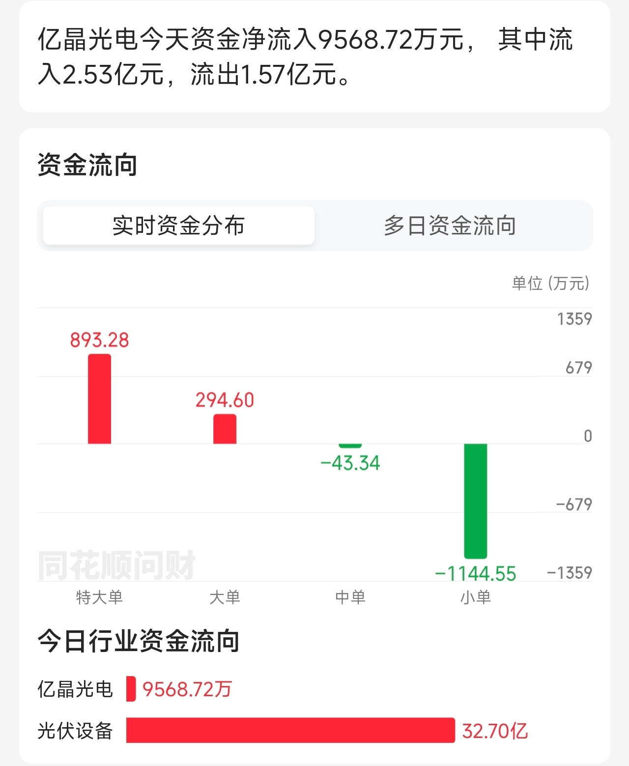 特大单交易情况也显示出市场对亿晶光电的青睐。特大单买入金额为 4573 万元,特大单卖出金额为 3660 万元,特大单净额为 913 万元,超过了 87.00%的上市公司。这表明在大额交易层面,投资者对亿晶光电的关注度和参与度较高,进一步强化了市场对其积极的预期。