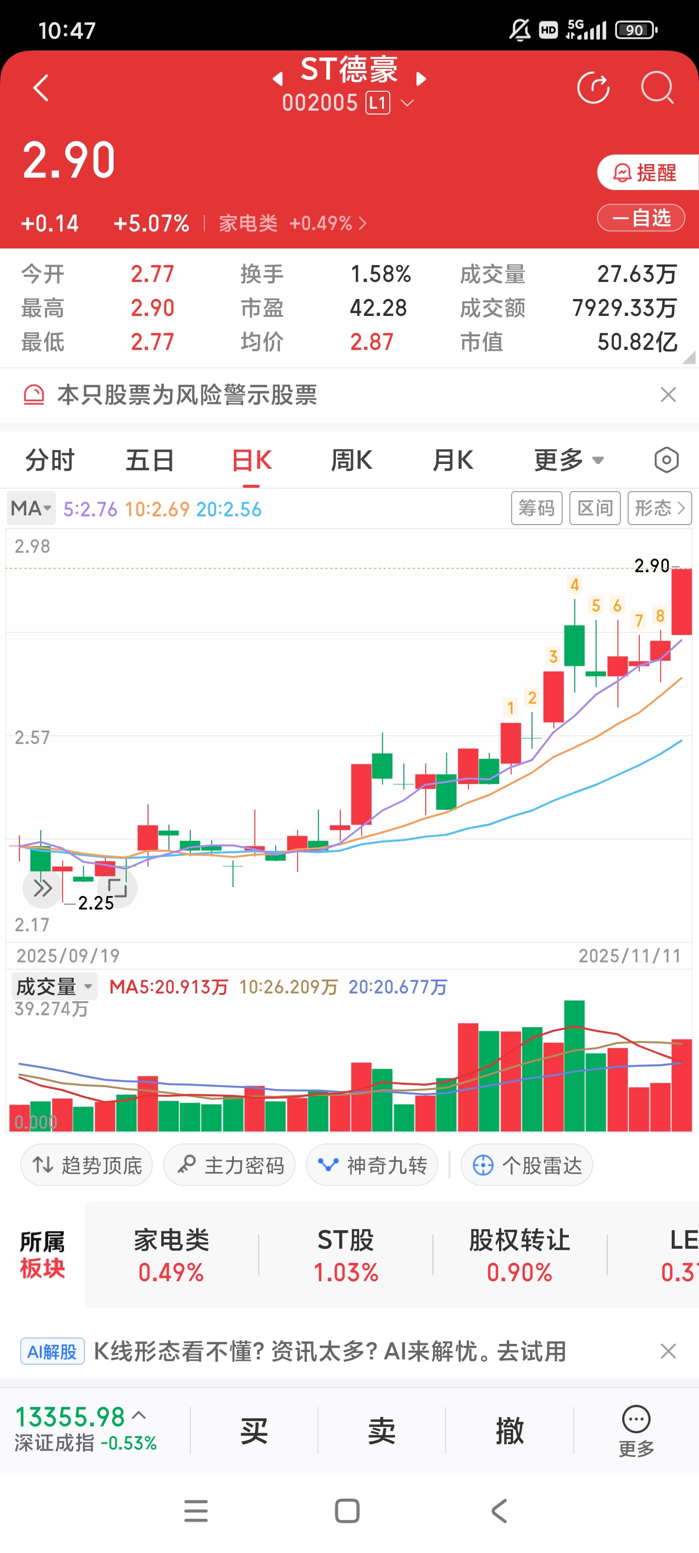 昨天4.5几买的,想同步模拟盘时已直线拉涨停,今天也卖低了,赚10个点出了,因为