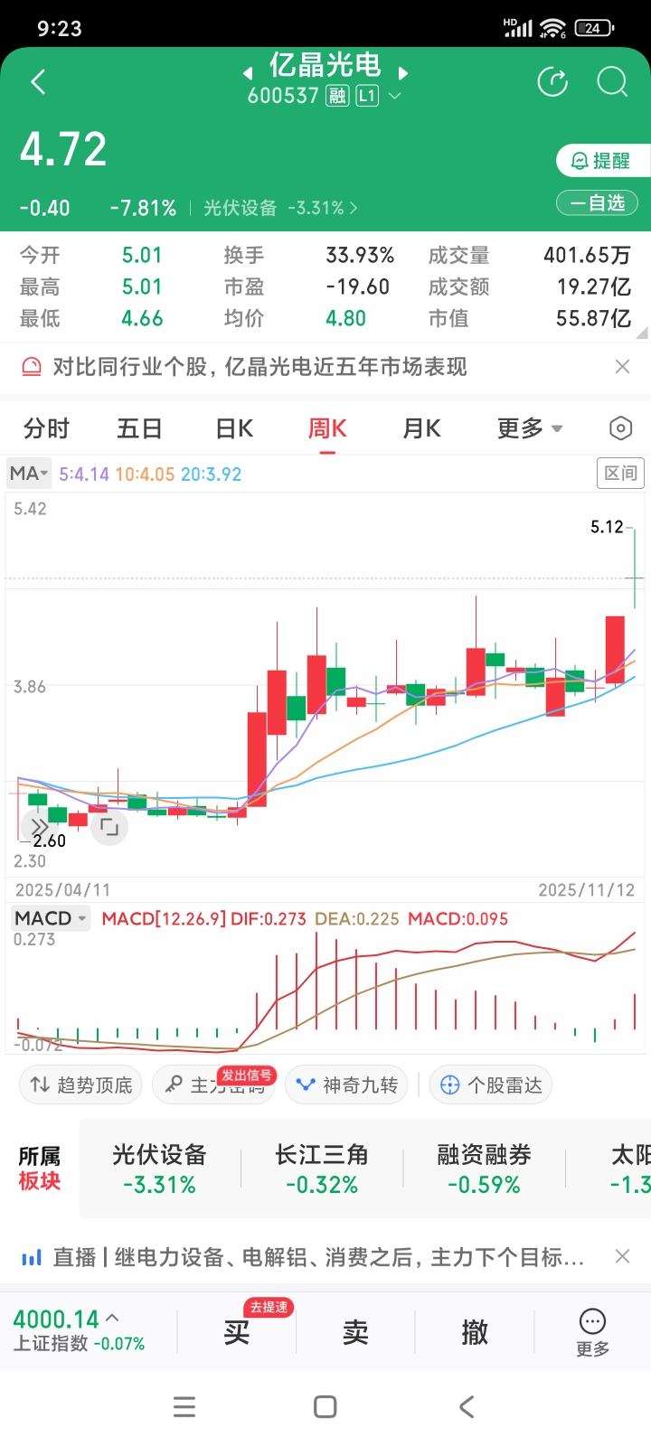 $亿晶光电(SH600537)$ 周K线4.73开,本周股价振荡后会站在4.73以上,上涨放量,下跌缩量,后期仍看好亿晶光电,今天亿晶光电早盘开盘那波下跌曾4.68下单买入,没成交就撤单了。随后盘中看盘全仓买入ST宝鹰。宝鹰极大可能再次向上走出连续涨停板。