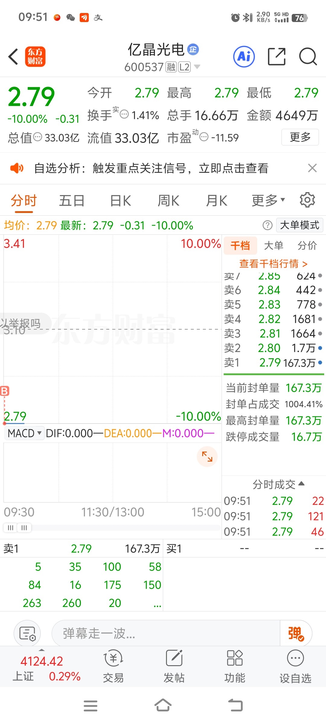 $亿晶光电(SH600537)$ 太可怜了,听说还有新入市的散户,上来就吃一字跌停板,我贡献15手,微不足道希望你们能跑出去吧