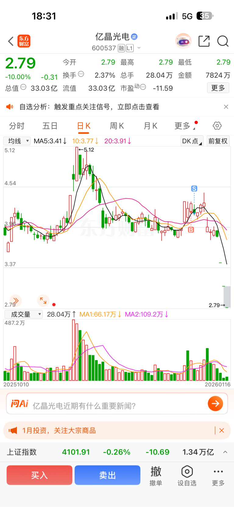 $亿晶光电(SH600537)$ 没想到啊,那天手贱买了,看到资产为负,第二天直接跑,已经顾不上亏不亏了。好家伙,真的这么准啊!