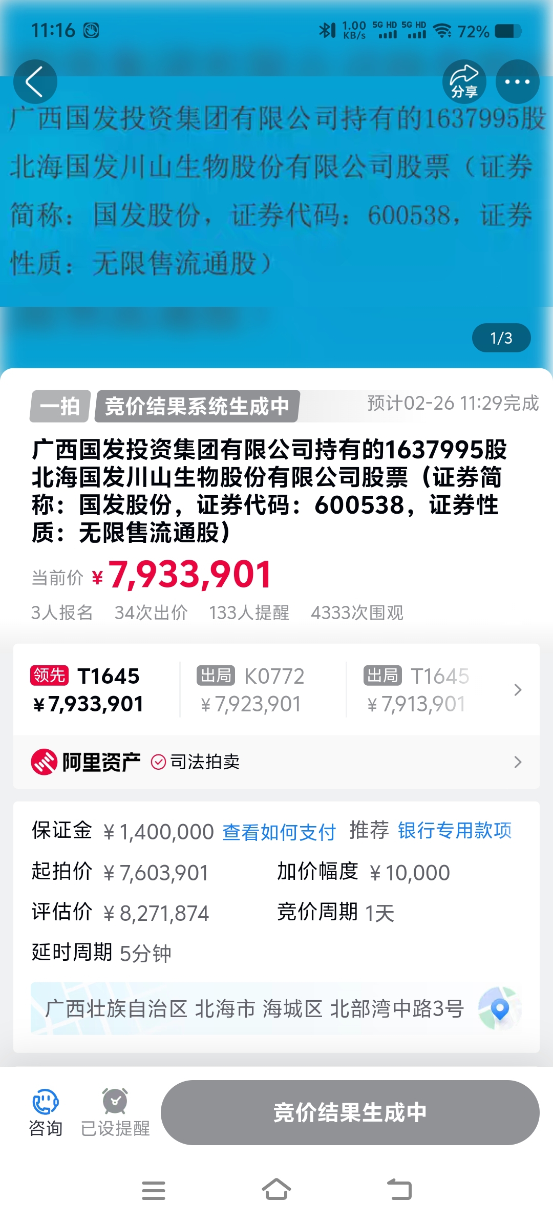 $国发股份(SH600538)$ 拍卖结束由T1645买家拍得1637995股国发股份股票最后成交价格是7933901元。