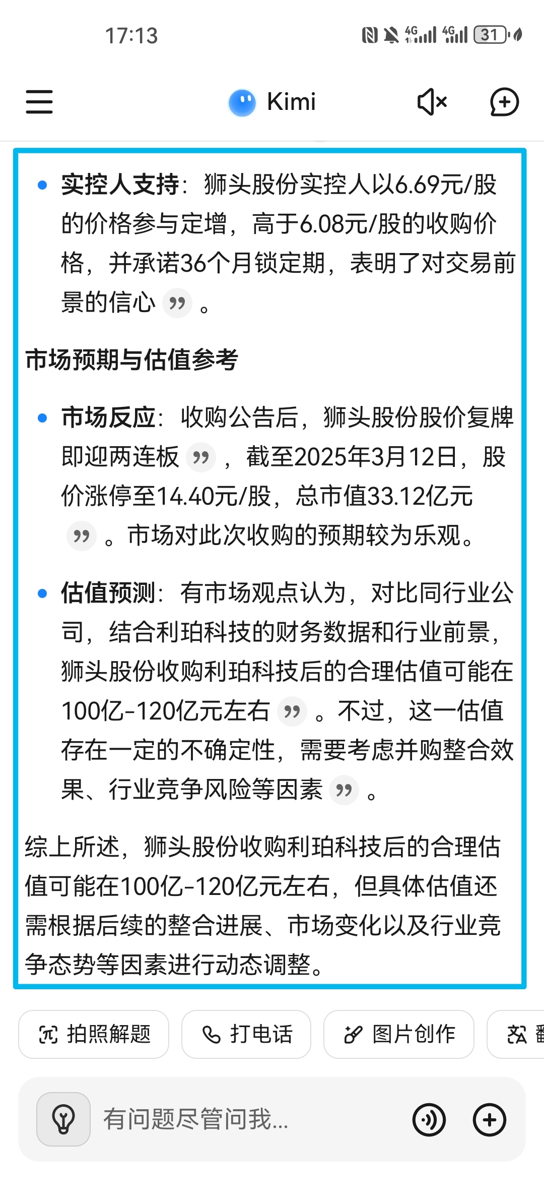 按照kimi给的可比市场估值狮头股份明天开盘开始连续涨停连续涨停了!