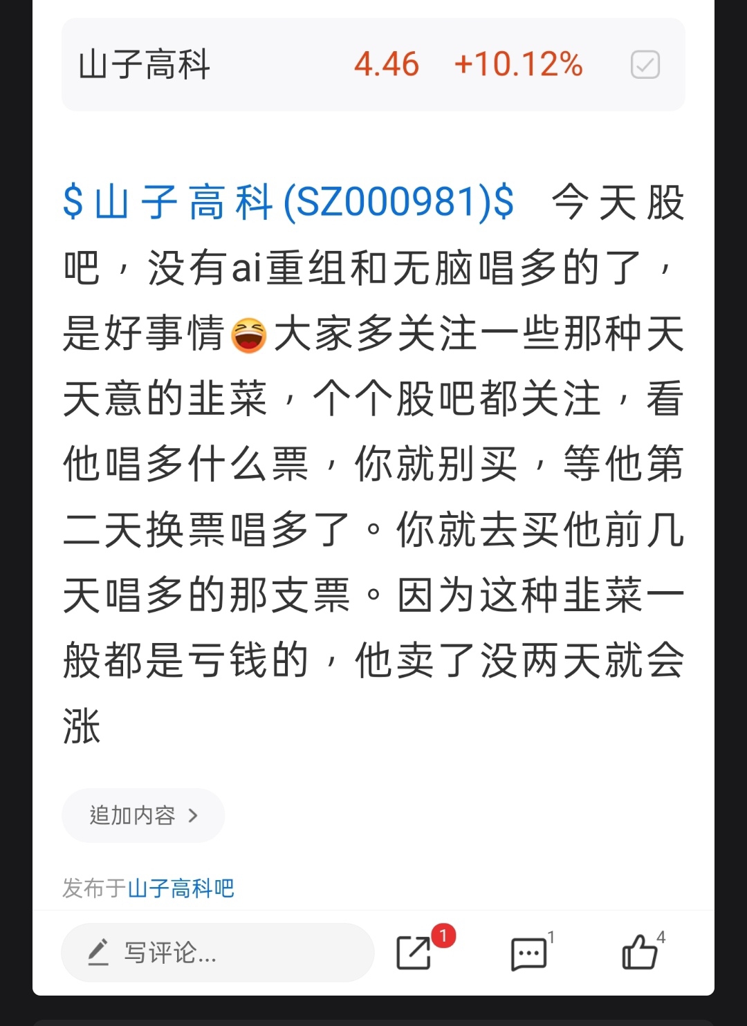 温馨提示: 1.根据《证券法》规定,禁止编造、传播虚假信息或者误导性信息,扰乱证券市场;2.用户在本社区发表的所有资料、言论等仅代表个人观点,与本网站立场无关,不对您构成任何投资建议。用户应基于自己的独立判断,自行决定证券投资并承担相应风险。《东方财富社区管理规定》