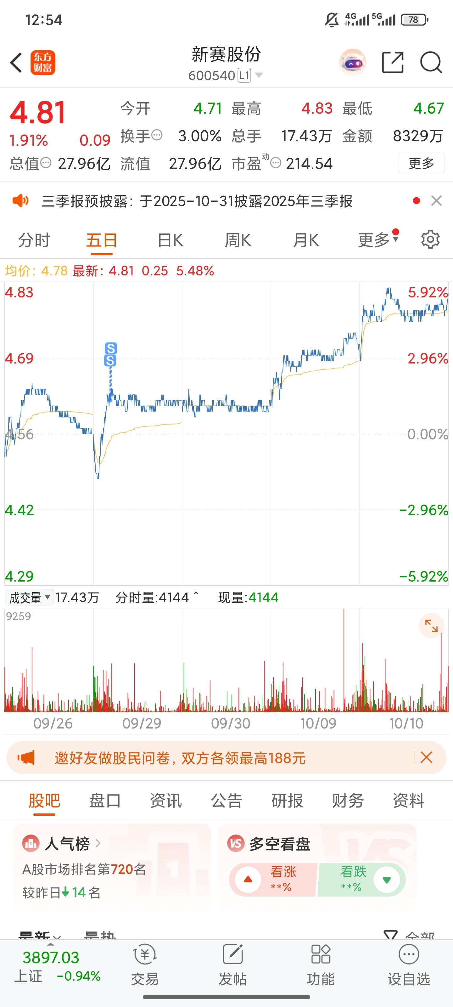 $新赛股份(SH600540)$ 这货大概率要涨停了,老夫一卖就涨。。。