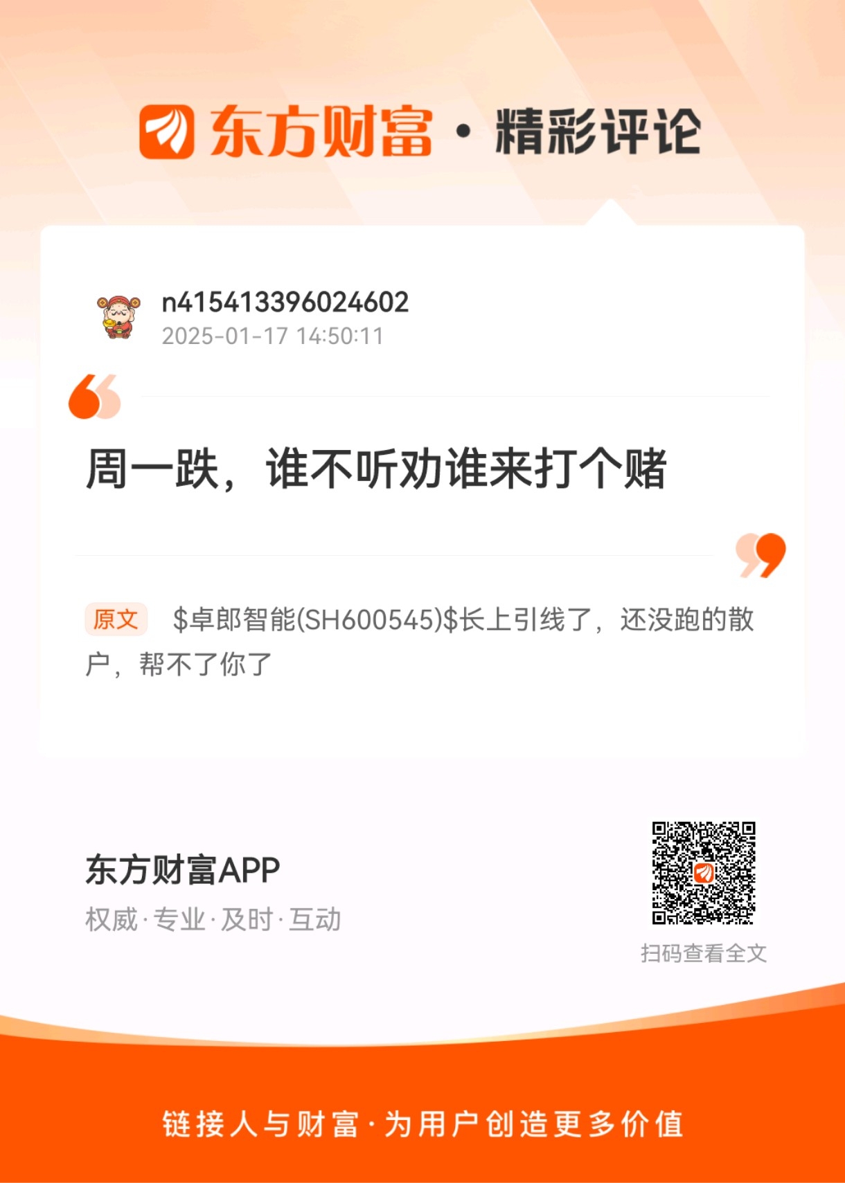 温馨提示: 1.根据《证券法》规定,禁止编造、传播虚假信息或者误导性信息,扰乱证券市场;2.用户在本社区发表的所有资料、言论等仅代表个人观点,与本网站立场无关,不对您构成任何投资建议。用户应基于自己的独立判断,自行决定证券投资并承担相应风险。《东方财富社区管理规定》