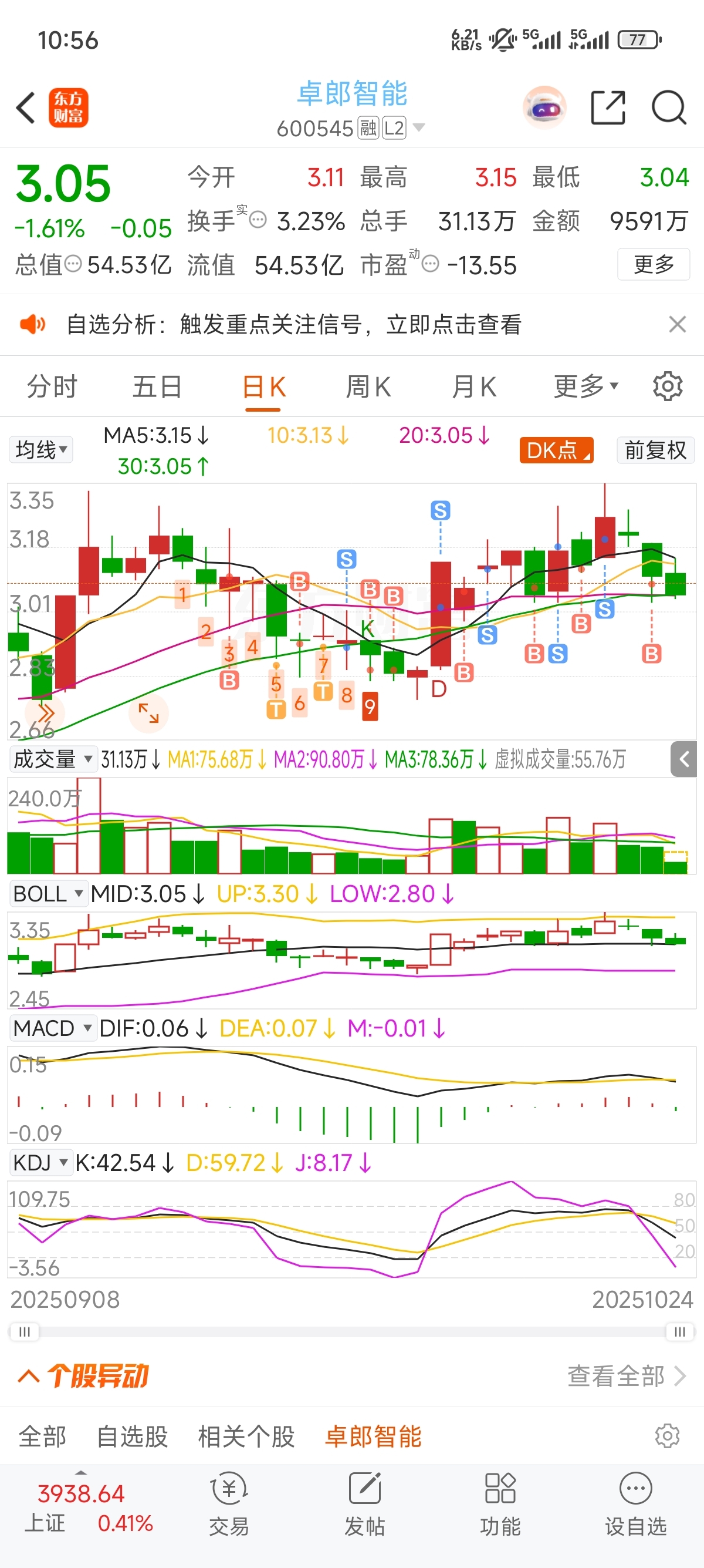 早上有点忙顾不上看,挂了个3.13结果没卖出去!kdj和macd都是死叉,短期看