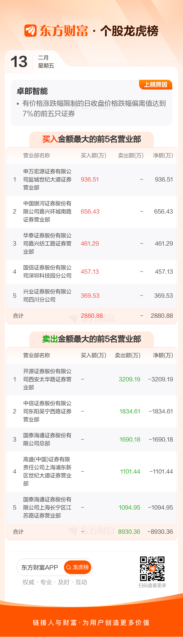 交易所2026年2月13日公布的交易公开信息显示,卓郎智能因成为有价格涨跌幅限制的日收盘价格跌幅偏离值达到7%的前五只证券上榜。卓郎智能当日收报2.95元,涨跌幅-10.06%,偏离值-8.80%,换手率7.85%,成交额4.26亿。