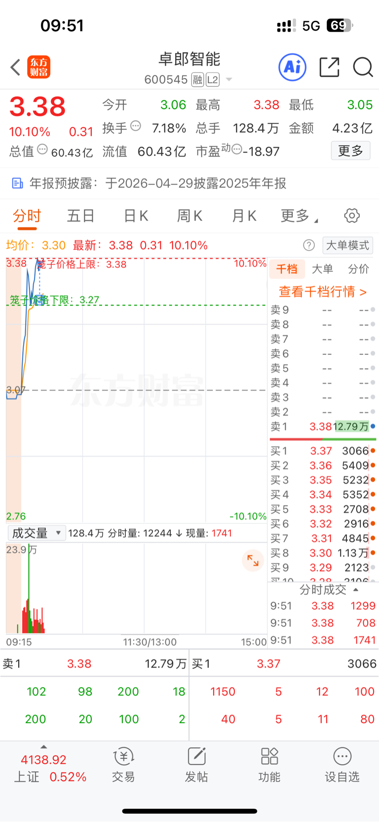 $卓郎智能(SH600545)$ 给我洗走了