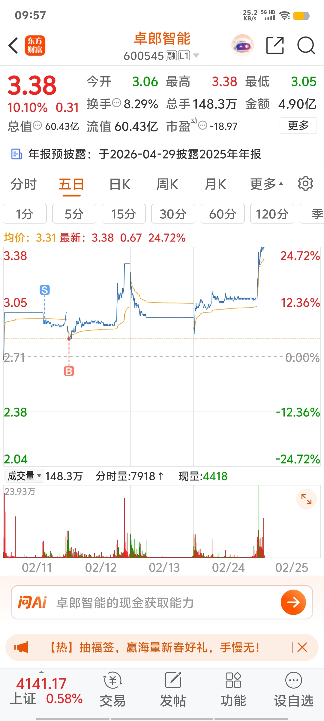 $卓郎智能(SH600545)$ 明天之后大概率是一字板,今天2.2个小目标封板,昨天低开三个点把散户洗了差不多,短期看到5块,但有可能不止5块,技术形态周线月线的走势太好了,月线才第一根阳线,我之前评论有画图,从之前走势中线看绝对不止这一根阳线,所以有可能去9块,就看能不能拿稳,我满仓不动摇,随便怎么洗