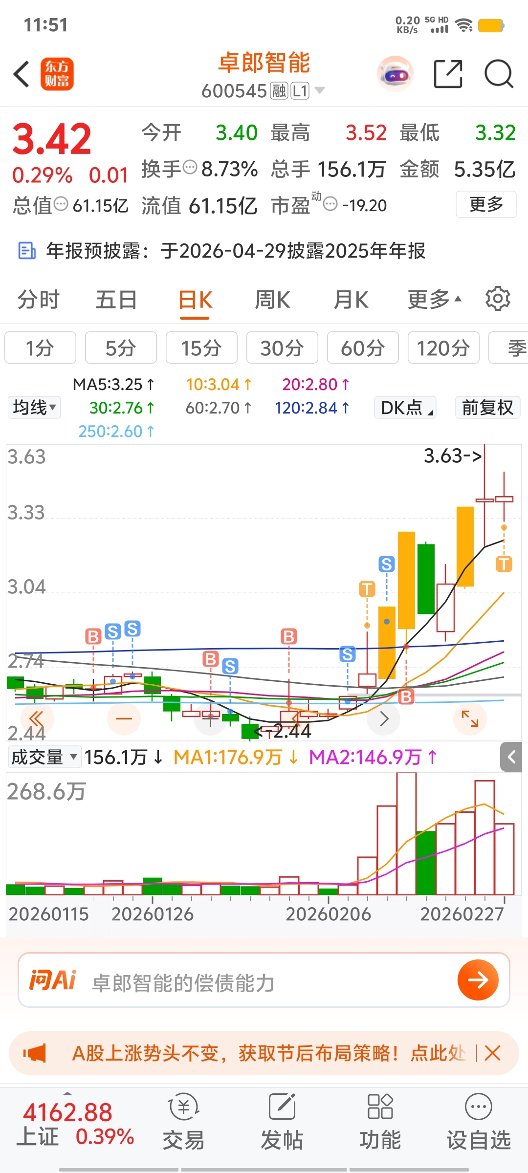 $卓郎智能(SH600545)$ 第一天不封板尾盘一分钟才封,洗不坚定的,第二天再杀个低开几个点然后拉板,继续洗,第三天不是直接地板,慢慢杀,第四天在杀个低开把前面两天也要洗出去,第五天再拉板,第五第六天横盘而且上下线一样长,给你标准十字星,我猜周一周二可以收横盘阳线,周三周四直接来两根大阴线,回踩5或者10天均线再上