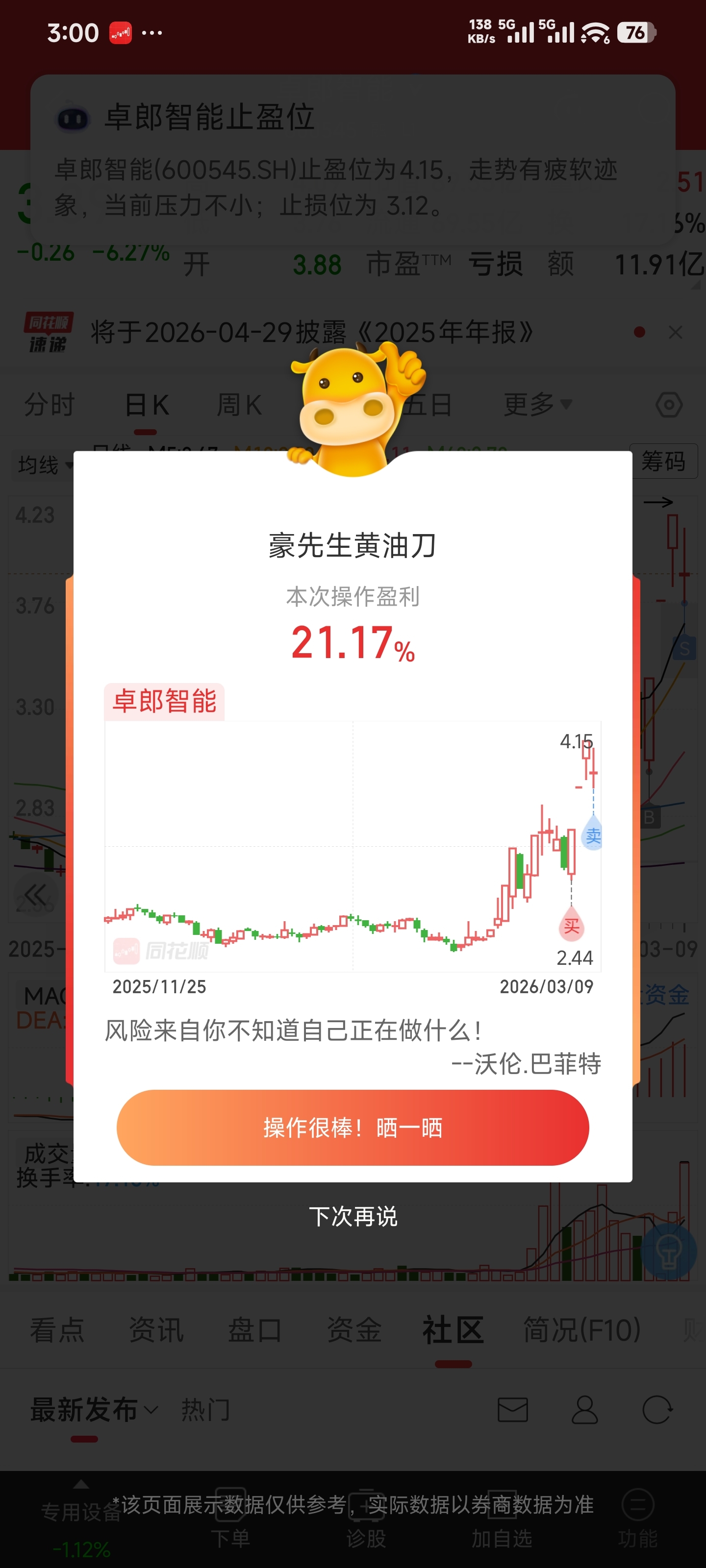 $卓郎智能(SH600545)$ 这是每天的盈利状况,已经进入下跌通道了,如果上个工作日卖就能赚30%。不过也是,有句话叫不赚最后一个铜板!也感谢主力让我吃到肉,在这里祝主力身体健康,爷爷做新郎。