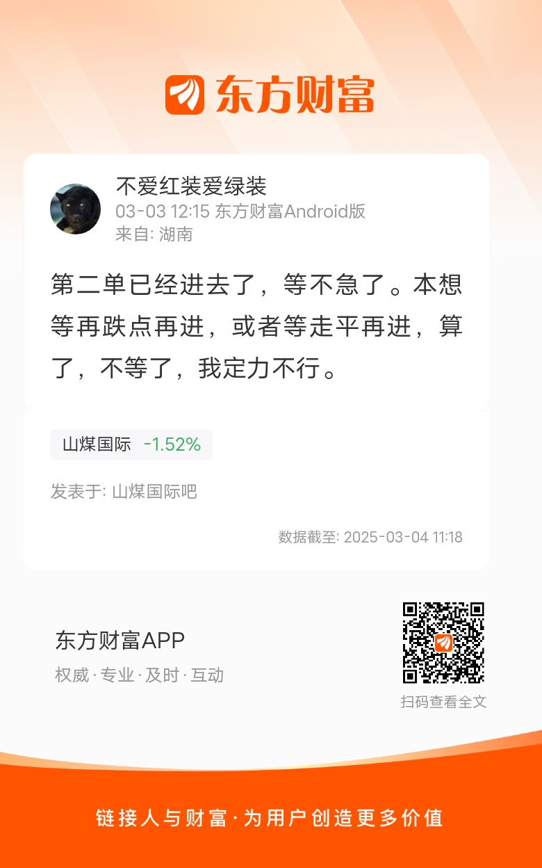 温馨提示: 1.根据《证券法》规定,禁止编造、传播虚假信息或者误导性信息,扰乱证券市场;2.用户在本社区发表的所有资料、言论等仅代表个人观点,与本网站立场无关,不对您构成任何投资建议。用户应基于自己的独立判断,自行决定证券投资并承担相应风险。《东方财富社区管理规定》