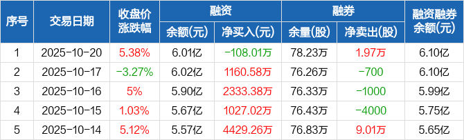 融资方面,当日融资买入1.01亿元,融资偿还1.02亿元,融资净偿还108.01万元。融券方面,融券卖出2.23万股,融券偿还2600股,融券余量78.23万股,融券余额903.56万元。融资融券余额合计6.1亿元。