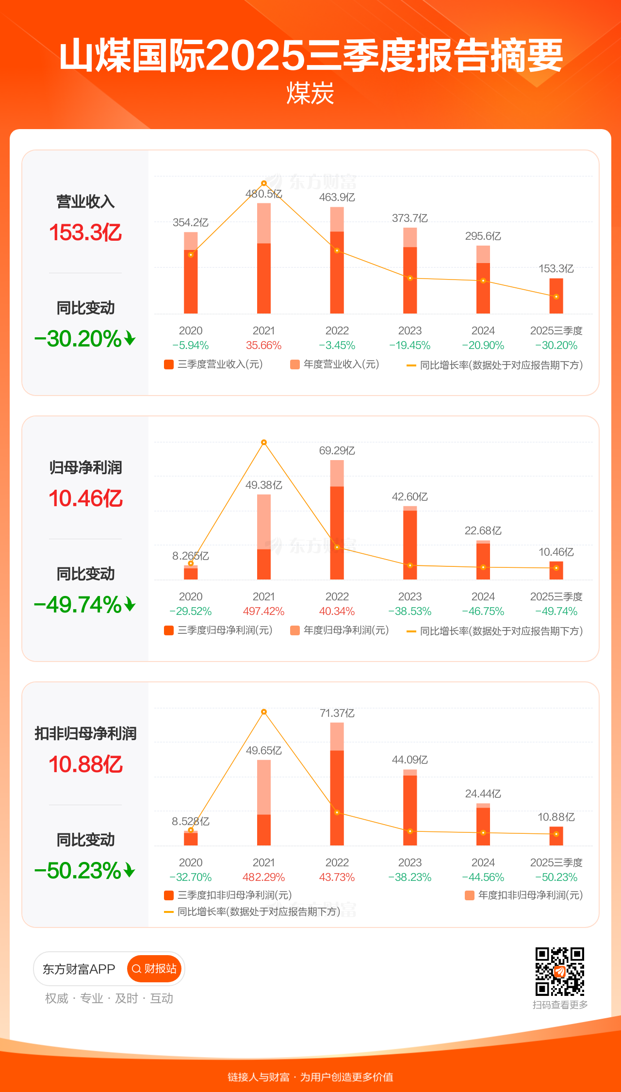 山煤国际10月31日发布2025年三季报显示,公司前三季实现营业收入153.32亿元,同比下滑30.20%;归母净利润10.46亿元,同比下滑49.74%;扣非归母净利润10.88亿元,同比下滑50.23%。