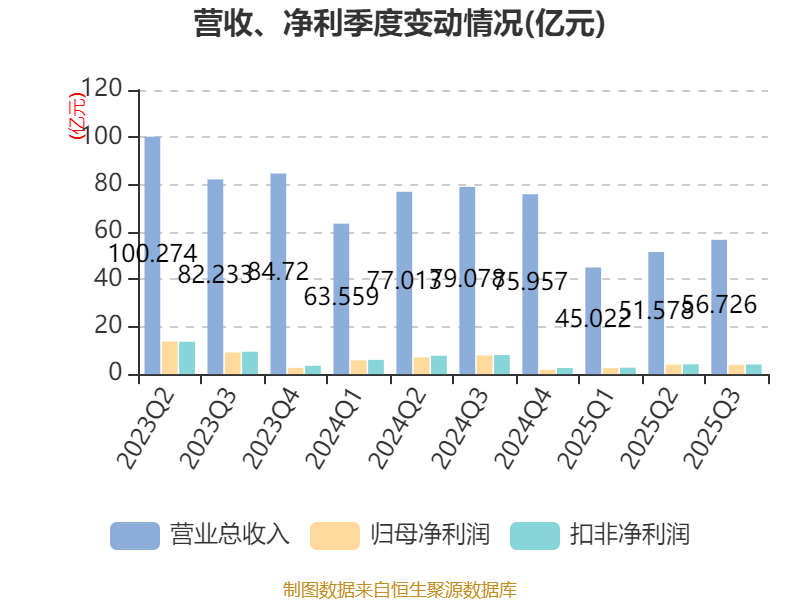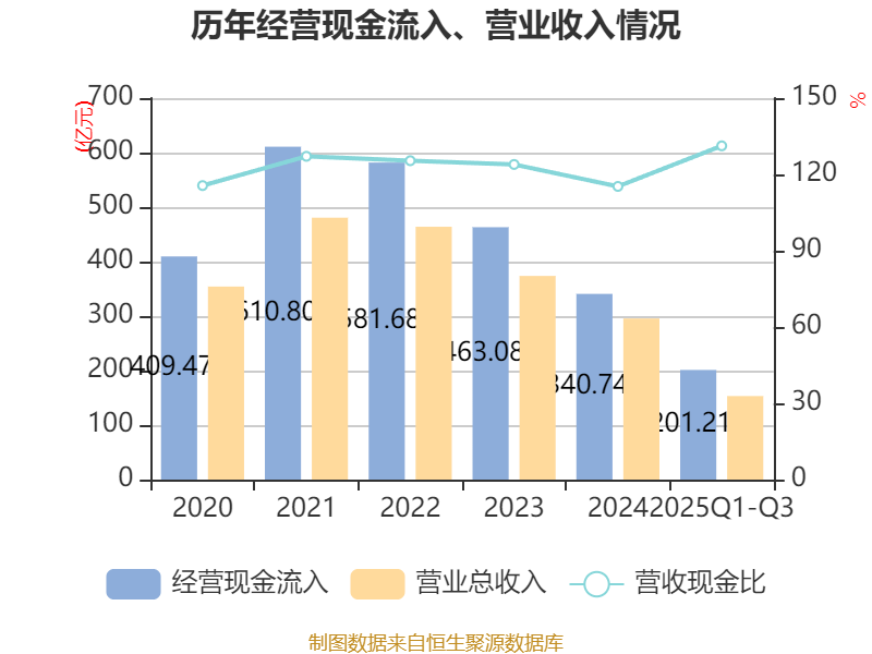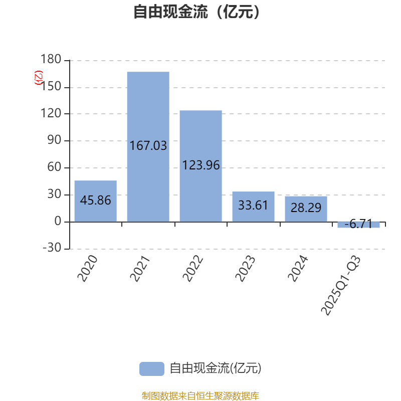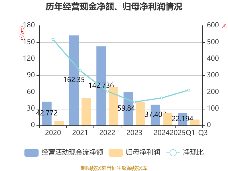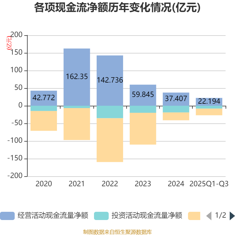 2025年前三季度,公司经营活动现金流净额为22.19亿元,同比下降38.21%;筹资活动现金流净额-18.87亿元,同比减少23.12亿元;投资活动现金流净额-8.11亿元,上年同期为-14.66亿元。
