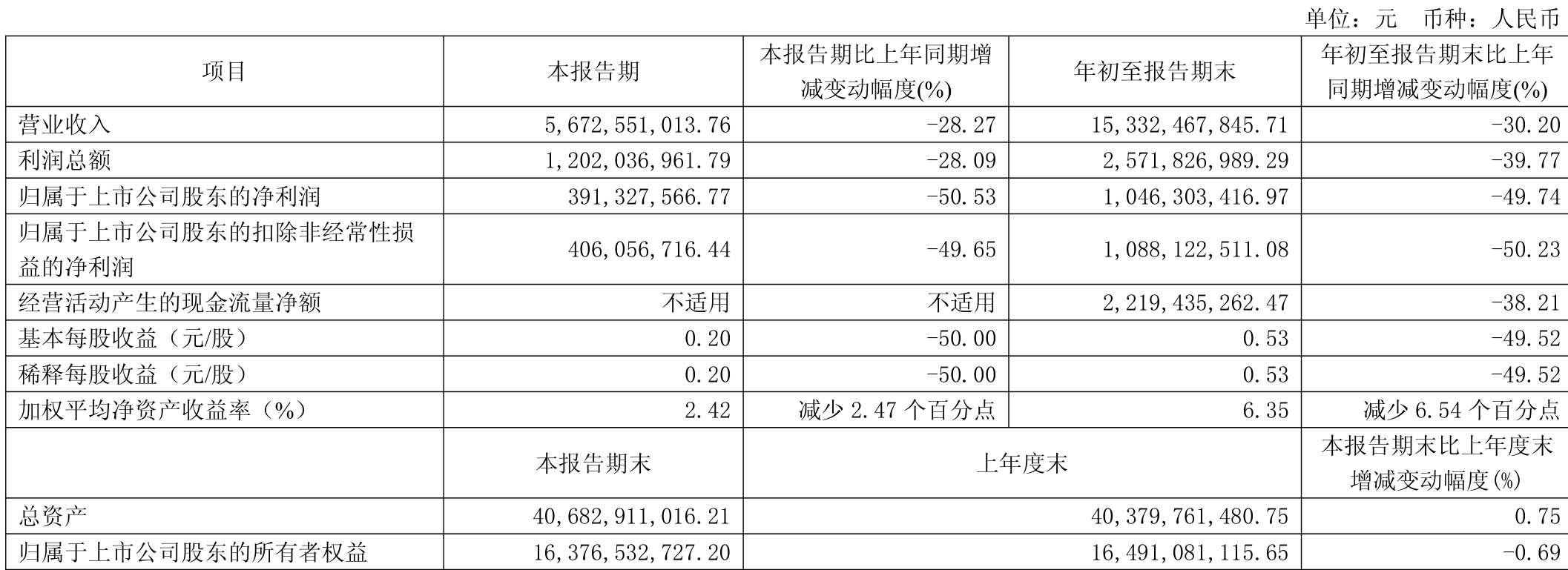 中证智能财讯山煤国际(600546)10月31日披露2025年第三季度报告。前三季度公司实现营业总收入153.32亿元,同比下降30.20%;归母净利润10.46亿元,同比下降49.74%;扣非净利润10.88亿元,同比下降50.23%;经营活动产生的现金流量净额为22.19亿元,同比下降38.21%;报告期内,山煤国际基本每股收益为0.53元,加权平均净资产收益率为6.35%。