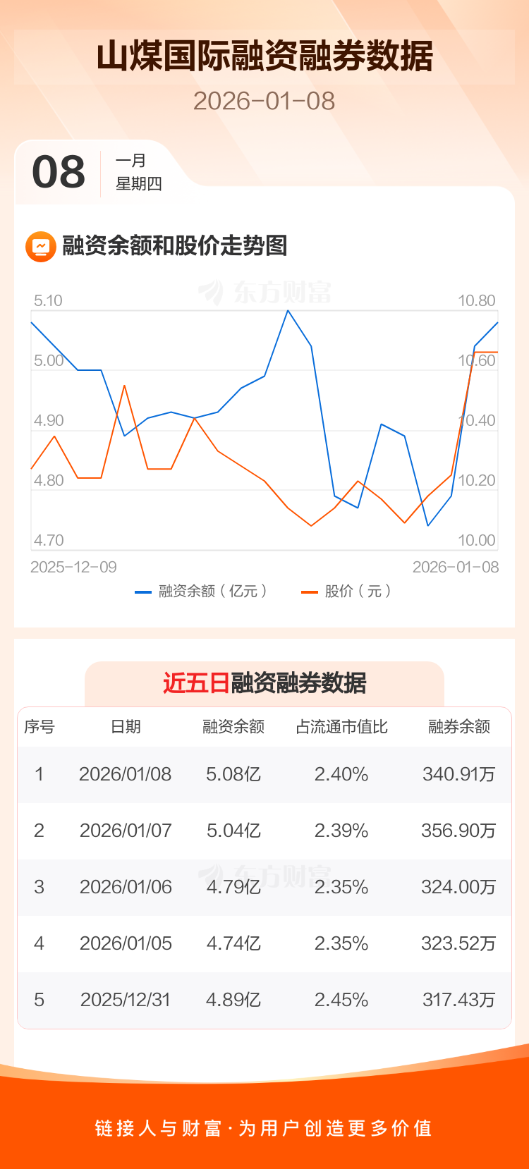 交易所最新数据显示,山煤国际于2026年1月8日获融资买入3625.94万元,融资偿还3218.36万元,当日融资净买入407.58万元。目前,该股融资余额5.08亿,占流通市值比例为2.40%。