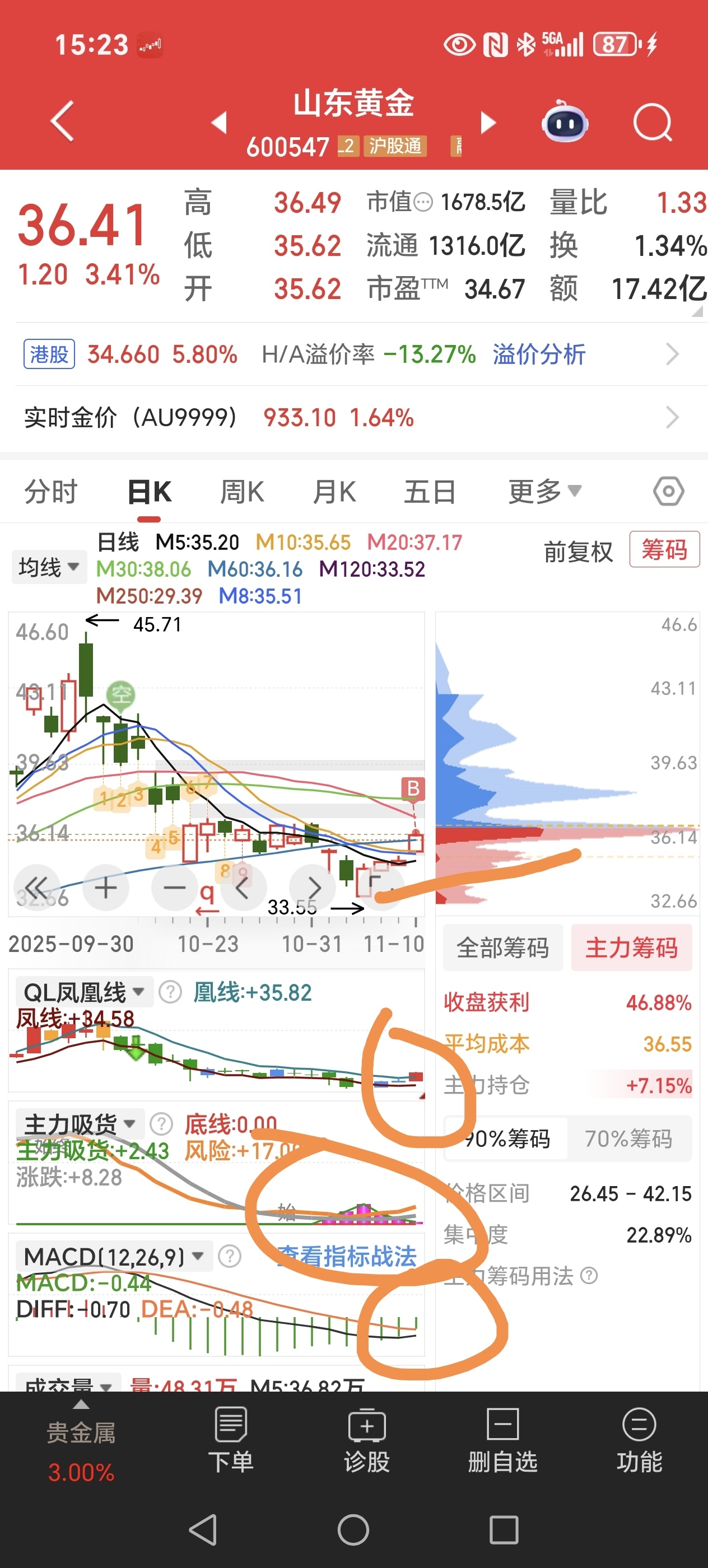 $山东黄金(SH600547)$ 今天进来不到两成仓,短期技术形态看着还可以,短期看看能不能把第一个缺口先补了