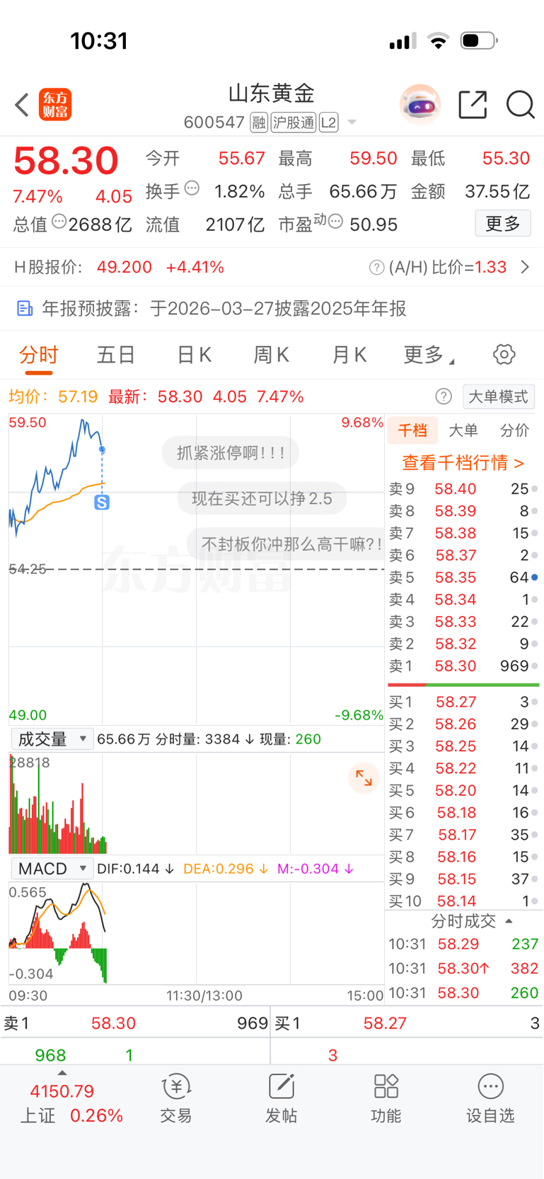 $山东黄金(SH600547)$ 一度9.2都没封板,就是没诚意,呵呵,昨天高位买,今天7个点我先撤。