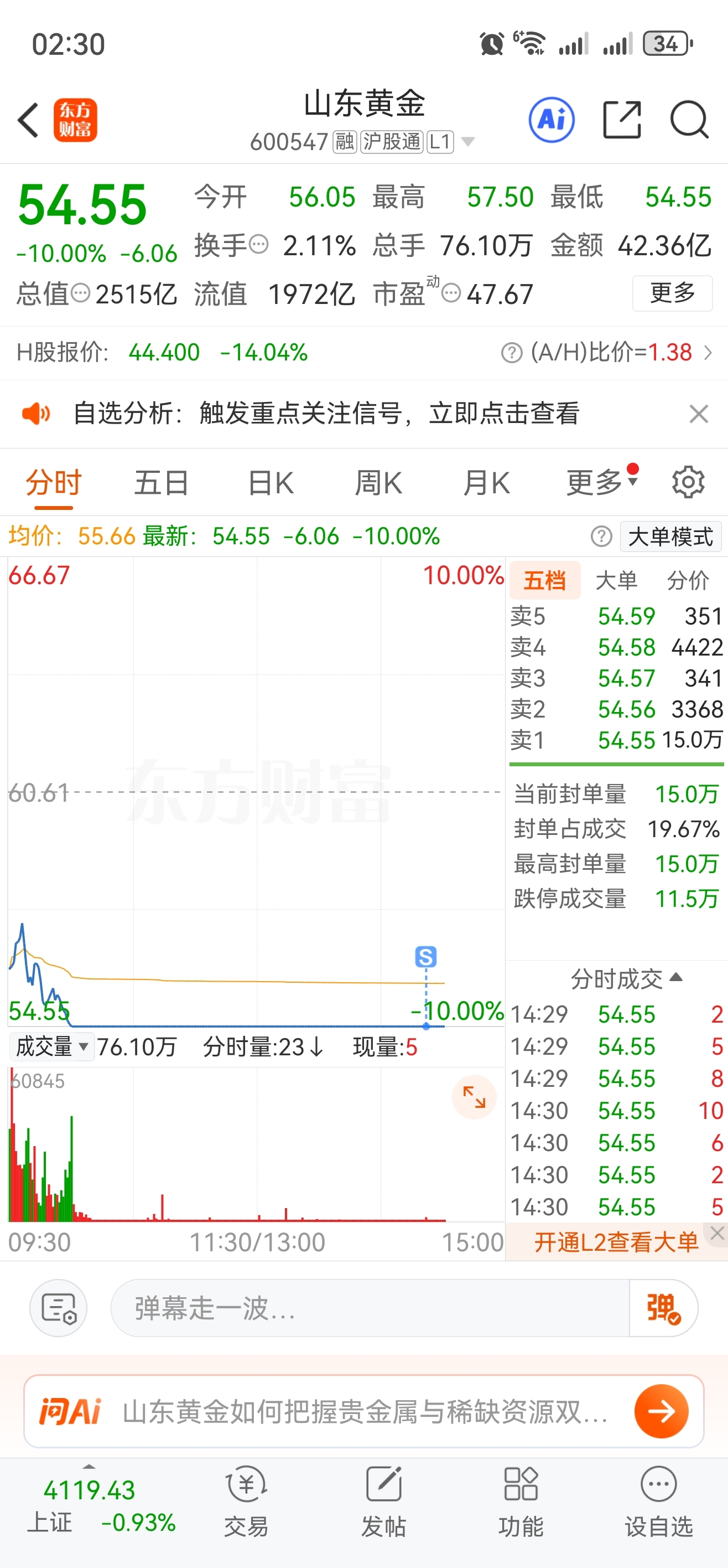 $山东黄金(SH600547)$ 昨天尾盘抄底,今天-10出局。亏1.1万,是我对不起大家,,黄金白银盯了半个月 昨天尾盘出手了!对不起,我挂跌停走了,希望大家能回点血