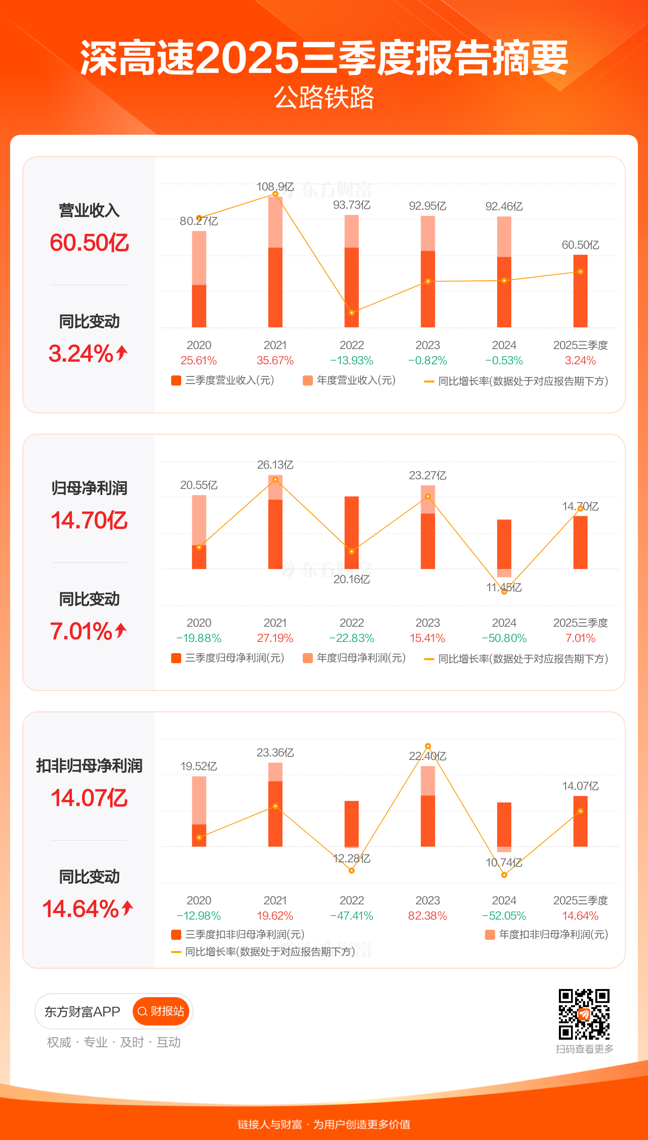 深高速10月31日发布2025年三季报显示,公司前三季实现营业收入60.50亿元,同比增长3.24%;归母净利润14.70亿元,同比增长7.01%;扣非归母净利润14.07亿元,同比增长14.64%。
