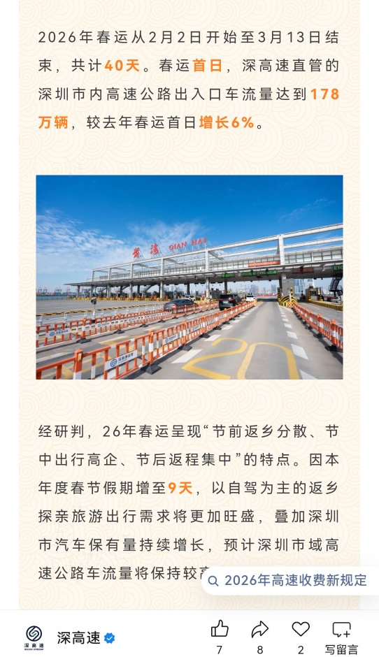 $深高速(SH600548)$ 。春运首日,深高速直管的深圳市内高速公路出入口车流量达到178万辆,较去年春运首日增长6%。