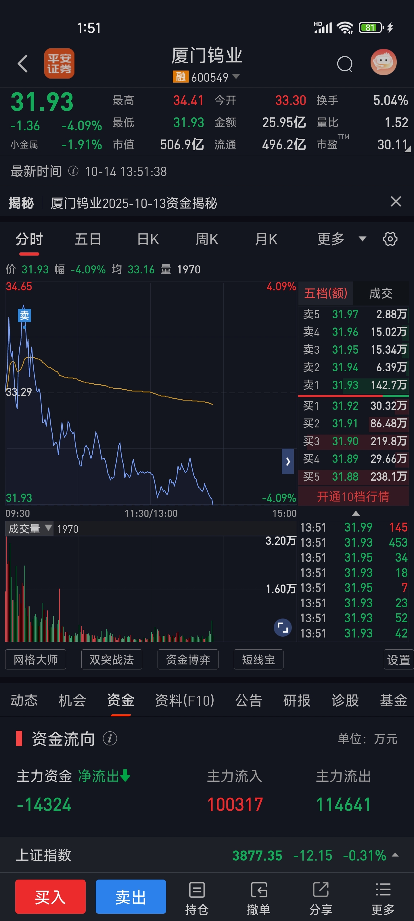 $厦门钨业(SH600549)$ 又跳水,还好早盘清了