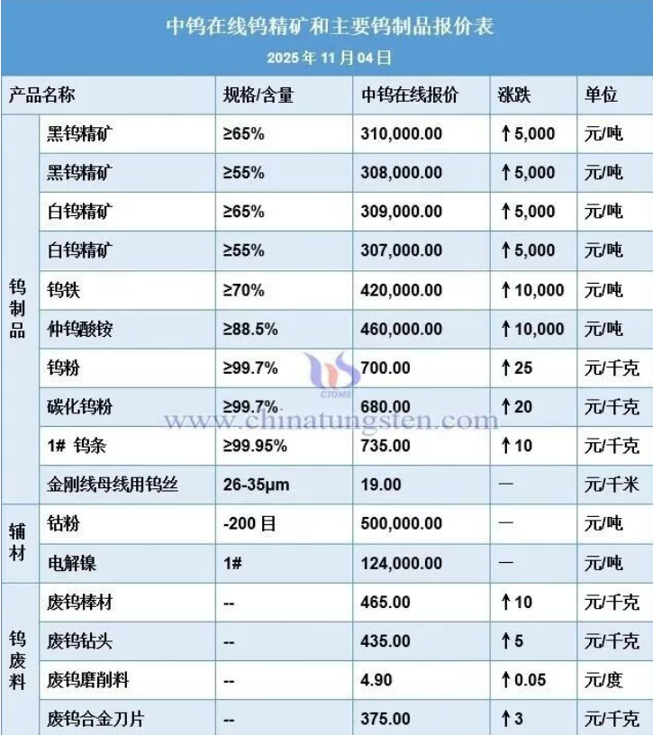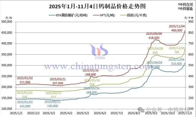 至2025年11月4日,钨矿飙至31万元/吨高位,APT触及46万元/吨水平,钨粉价格突破70万元/吨大关!
