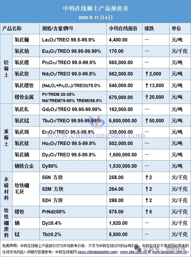 $厦门钨业(SH600549)$ 11月4日稀土价格继续上涨