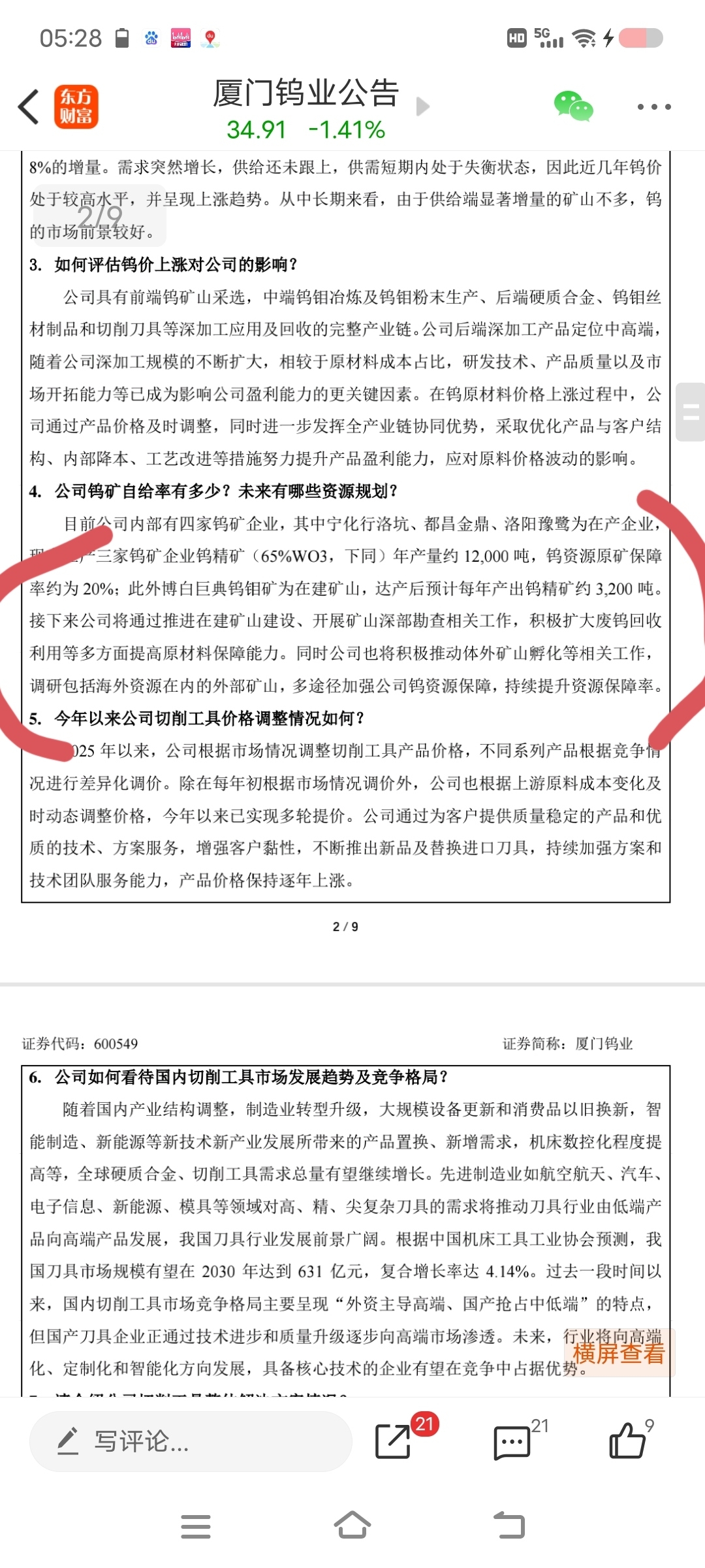 明年自家钨钼矿从20%提高到26%。根据钨和稀土长期涨价逻辑,钨比稀土还有更多空