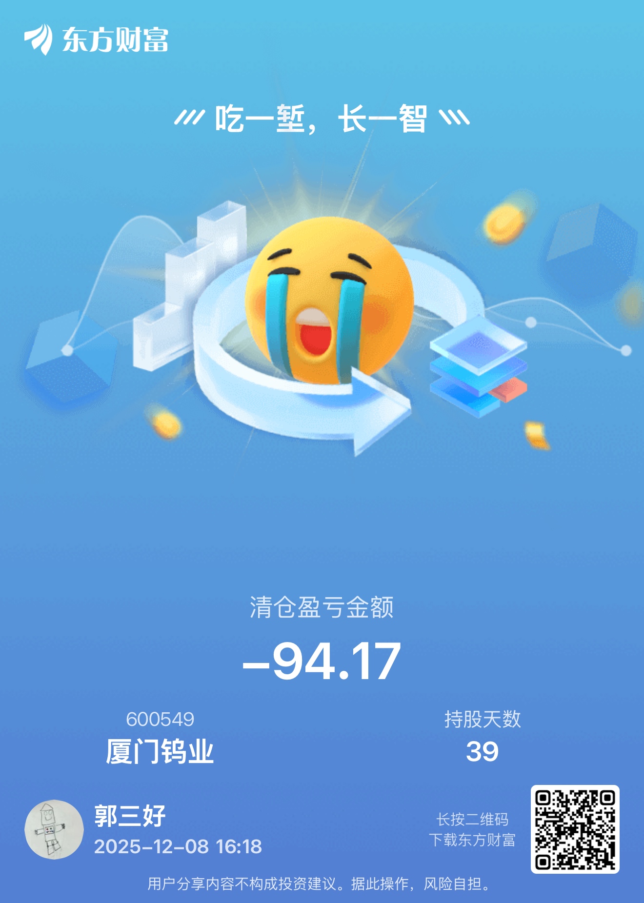 $厦门钨业(SH600549)$ 谢谢你!!!!新手小白从4000到3840到今天3980,本次,加上交手续费一共亏150。这个学费,交得值!!希望你越来越好