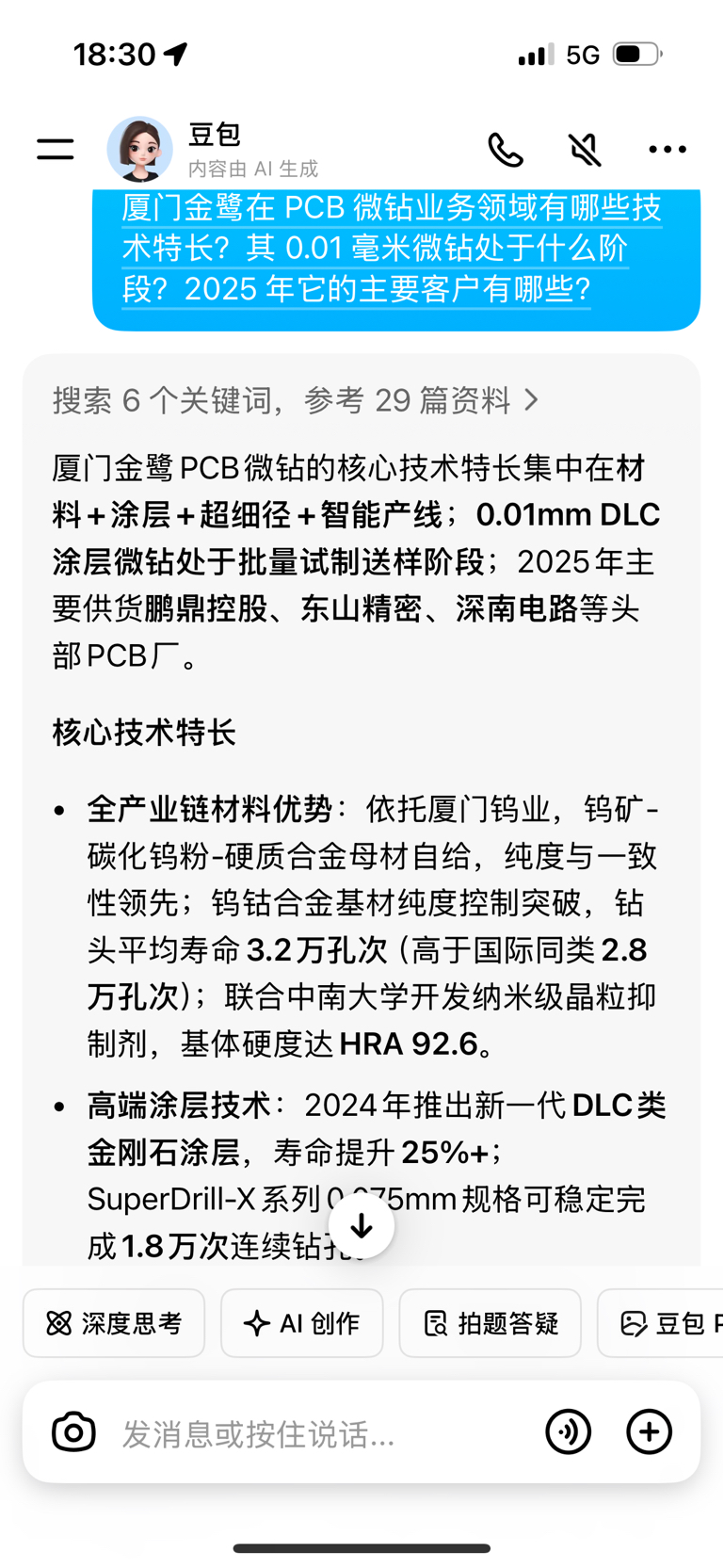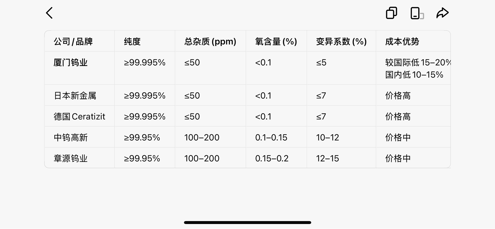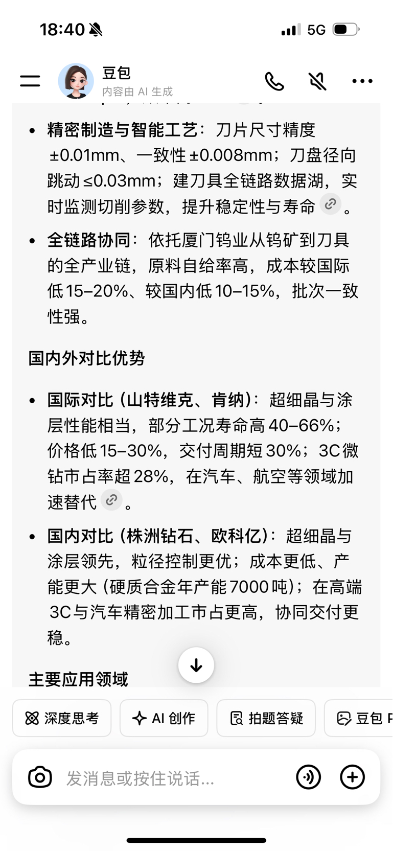 $厦门钨业(SH600549)$ AI还是挺好用的,虽然很多信息会有错误。但上述信息基本是经过我反复筛选比对后的,大家可以参考。硬质刀具、钻针只是钨钼应用的一个细分行业。但是未来在半导体及其他前沿科技的应用对纯度、超细晶粒、晶粒一致性等指标要求更高。做到国际一流水平,厦钨还有很大提高空间。