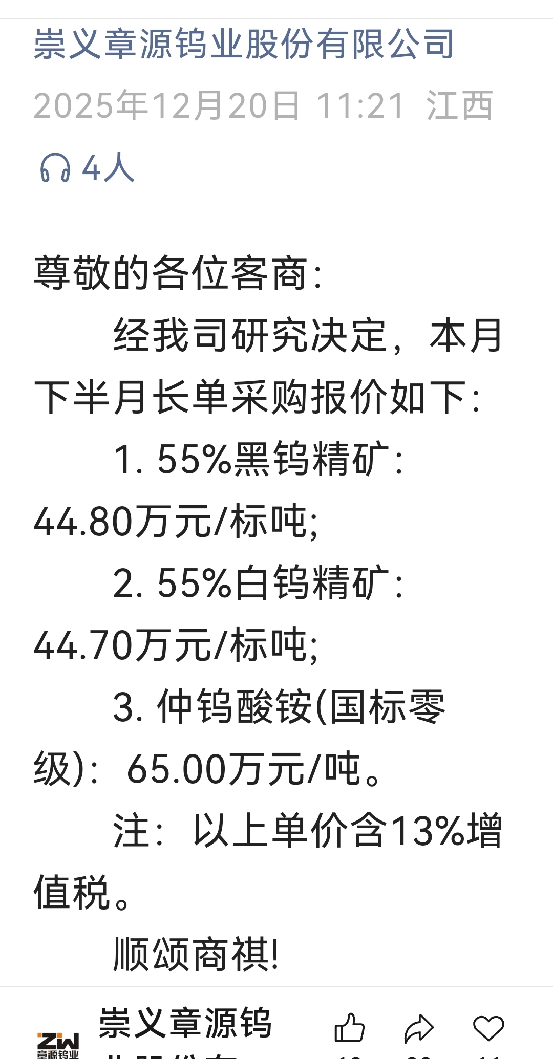 钨业主要企业锁定12月下半月长单价格,继续上调