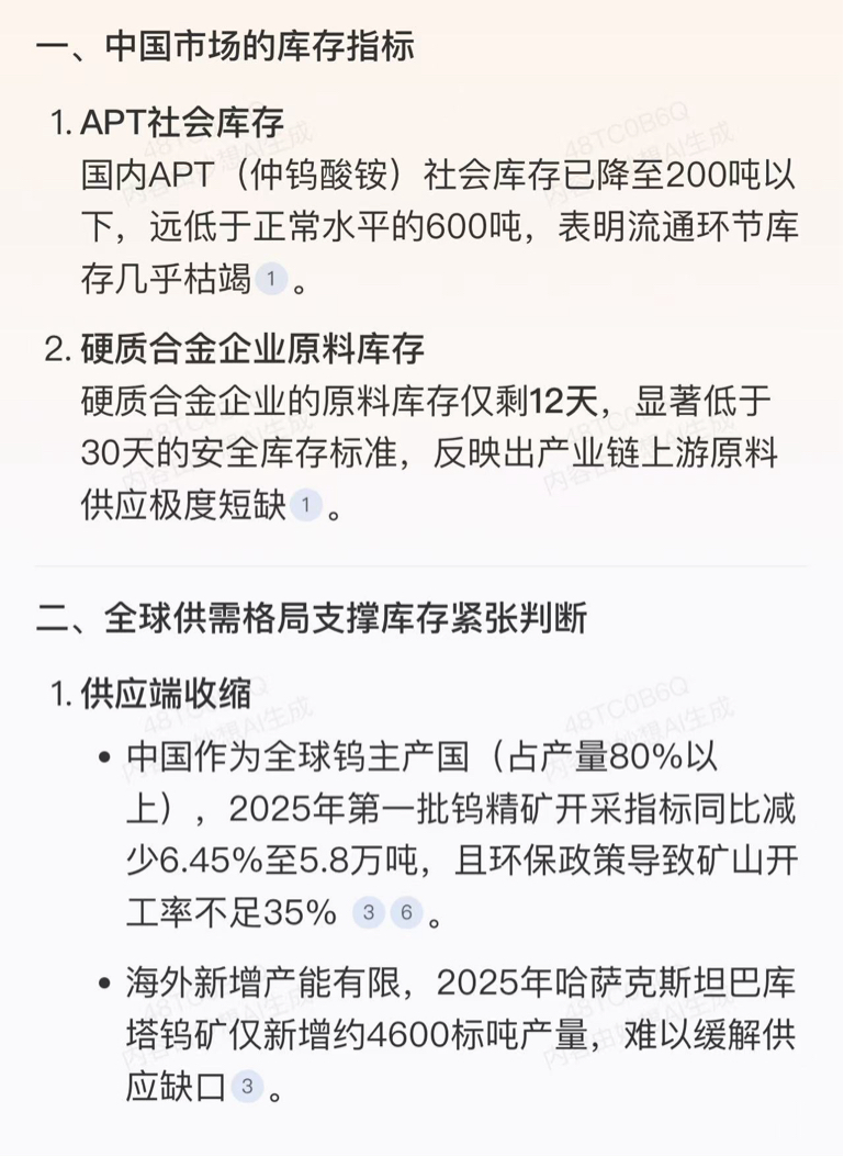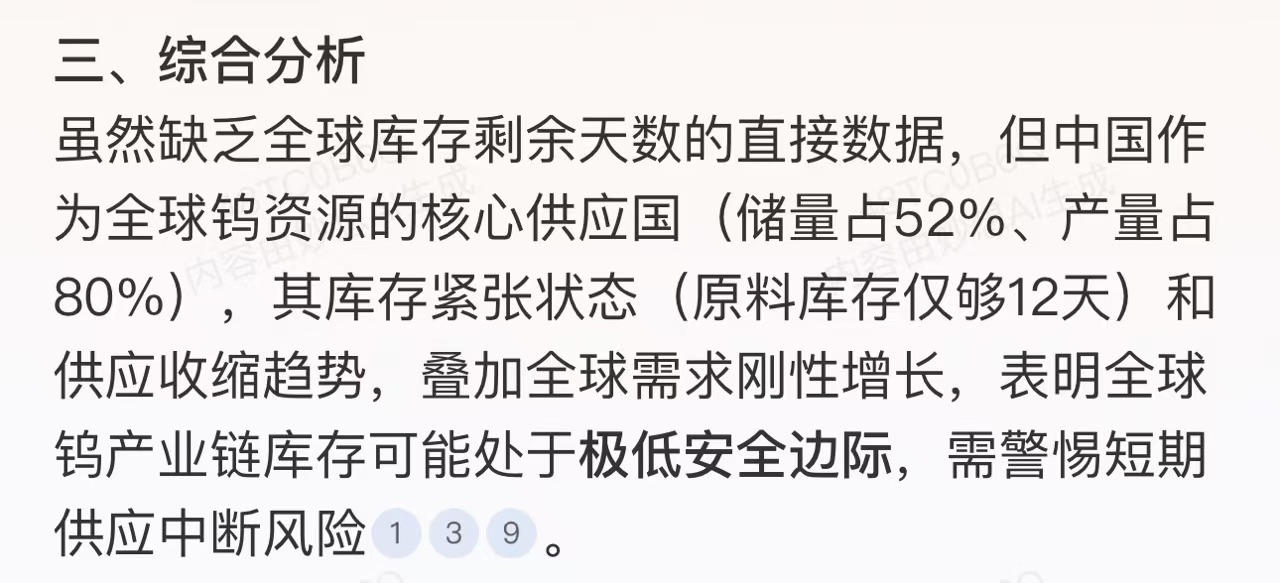 钨原材料库存仅剩12天了,原材料都快面临断供了,年前各企业都会提前囤货,感觉年底