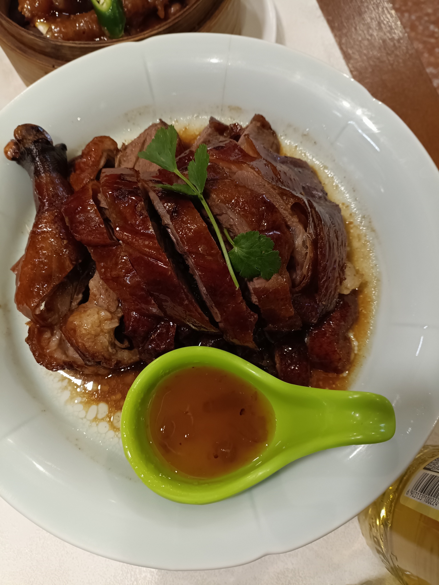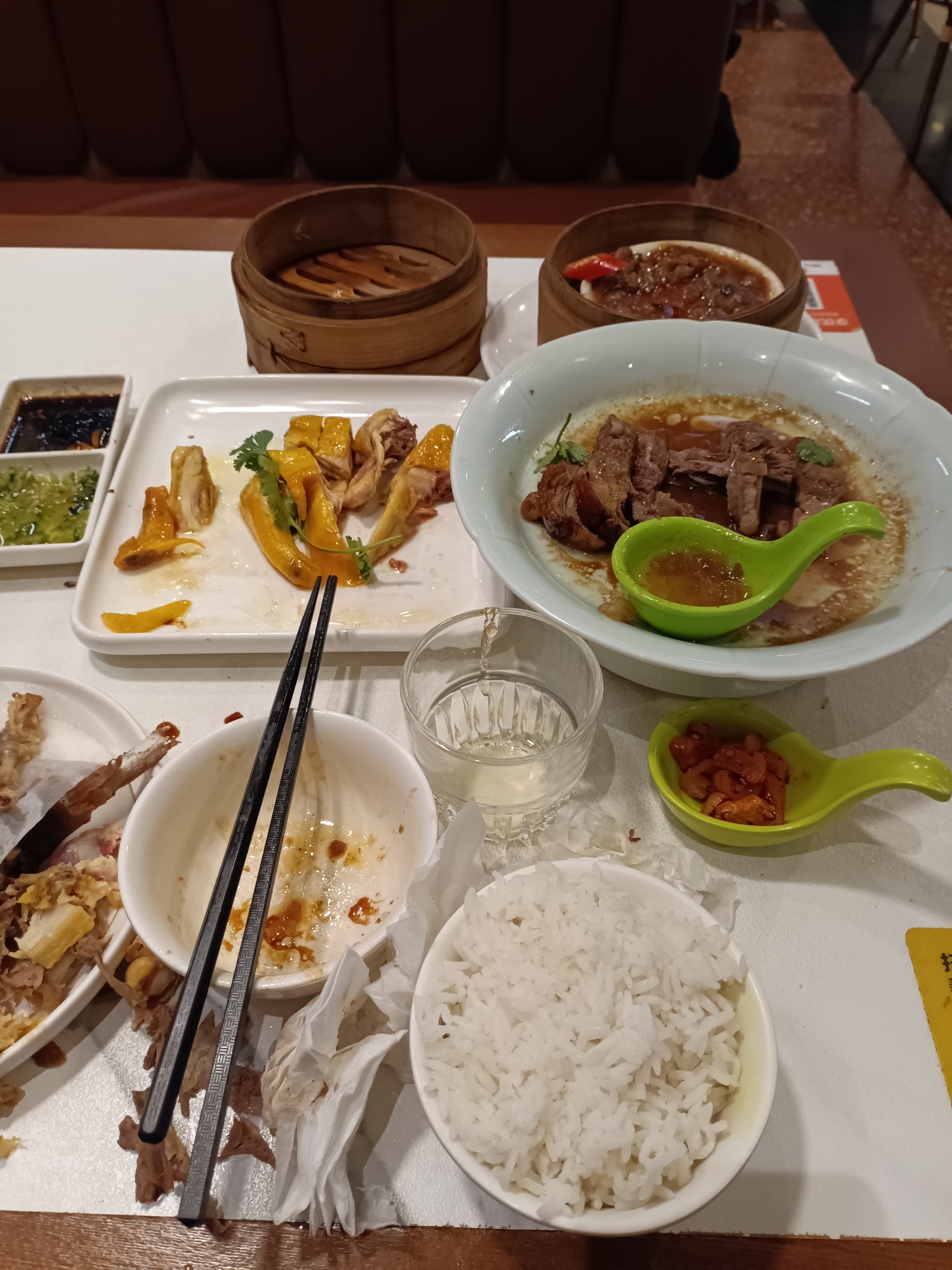 走过千厮门大桥,步行来到朝天门的来福士,必须吃正宗的粤餐厅,古法烧鹅(味美远超北京烤鸭),广式白切鸡,三只金牌虾皇饺,豆豉蒸凤爪,一只啤酒,花费203元,刚好。