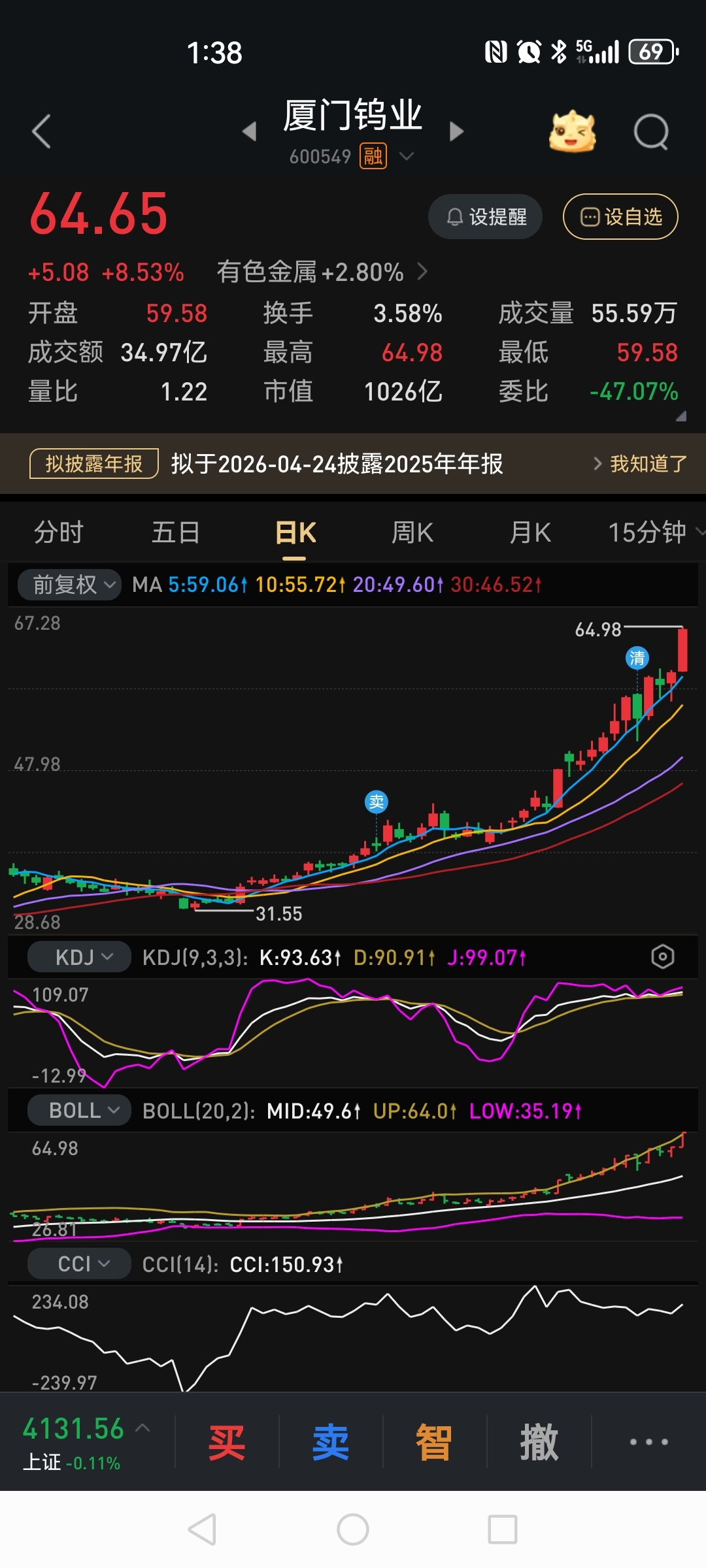 $厦门钨业(SH600549)$ 阴包阳 没拿住清仓了,赚不了大钱。