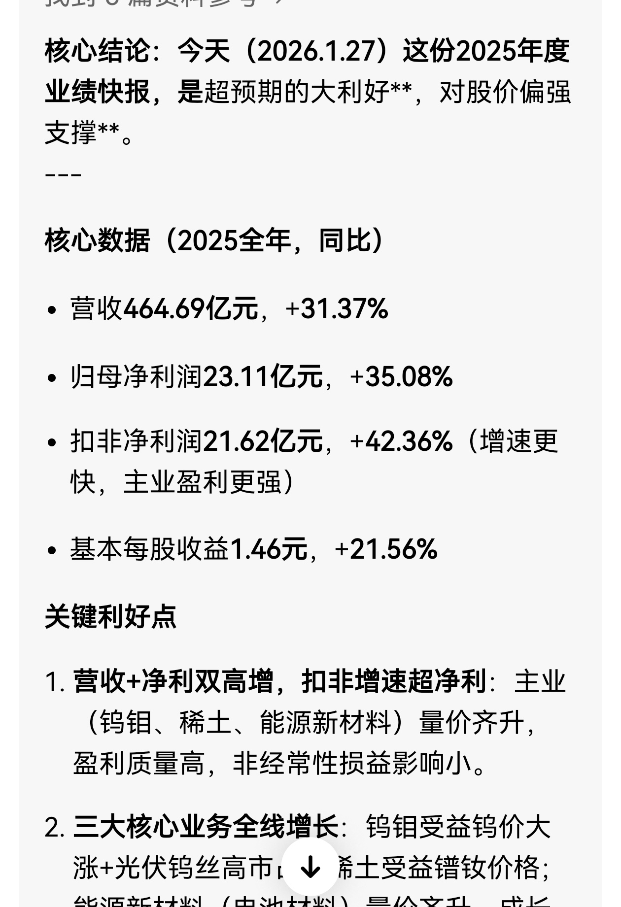 $厦门钨业(SH600549)$ 别整天的不知足,外面亏损或者盈利1-2亿的大市值公司多的是,这个业绩已经很好了,而且能预见26年一季度会更亮眼