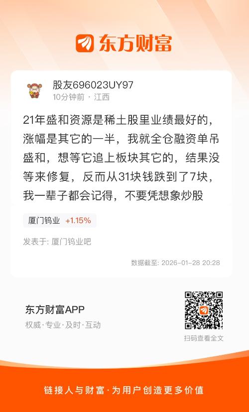 21年盛和资源是稀土股里业绩最好的,涨幅是其它的一半,我就全仓融资单吊盛和,想等它追上板块其它的,结果没等来修复,反而从31块钱跌到了7块,我一辈子都会记得,不要凭想象炒股